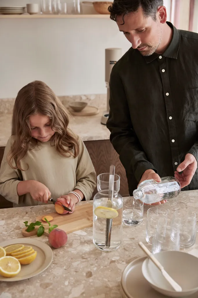 Das Volumen der Nesting Carafe ist individuell an Aarkes Sprudelwasser angepasst – plus Eiswürfel, Garnierung und einen Schuss unserer Aarke Drink Mixers.