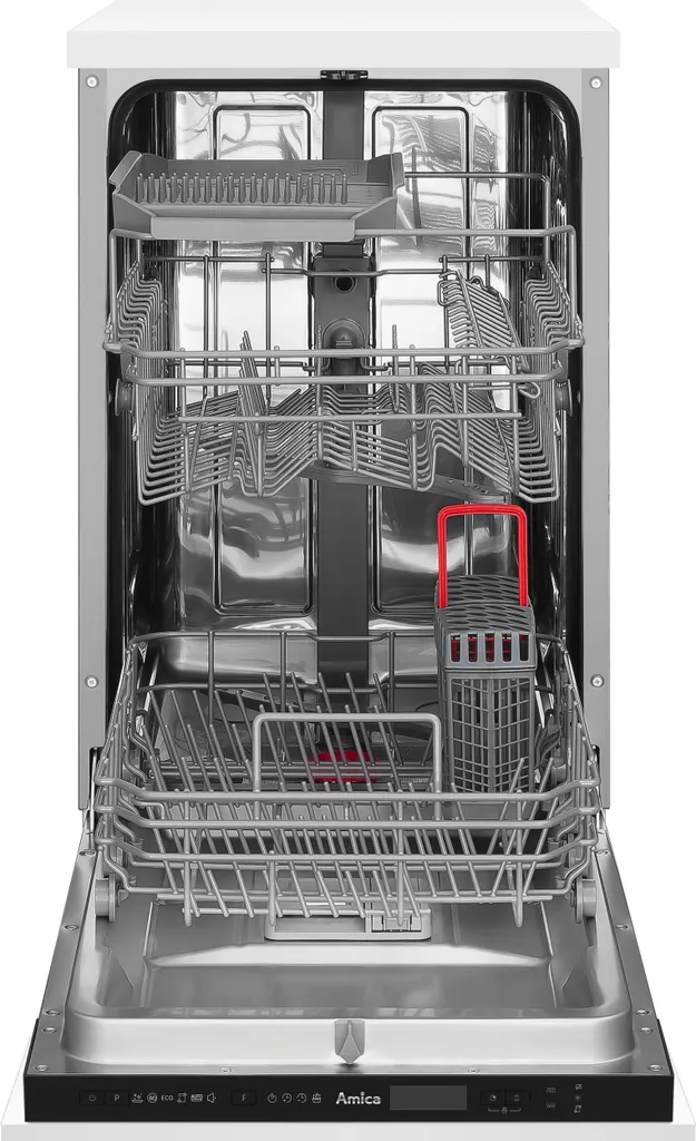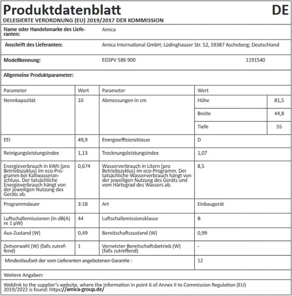 vollintegriert, 45 cm Breite, 10 Maßgedecke, Startzeitvorwahl, 6 Programme, Zonenspülen, Klarspüler- und Salzmangelanzeige, Innenbehälter aus Edelstahl, Lautstärke/Klasse: 44 dB re1pW, Wasseranschluss max.: 25 °C, Nischenmaß (HxBxT): 820,0 – 870,0 x 450 x min. 580 mm, hocheinbaubar, von vorne verstellbare Hinterfüße, Spannung/Frequenz: 230 V / 50 Hz, Gewicht netto/brutto: 34,5 kg / 40,0 kg