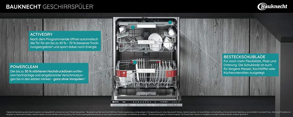 * Basierend auf der durchschnittlichen Trocknungsleistung und jeweiligem Energieverbrauch eines Bauknecht Einbau-Geschirrspülers mit zwei Körben und ActiveDry (mit kombinierter Beladung, einschließlich Kunststoff, Glas, Stahl und Porzellan) im Vergleich zu Bauknecht Einbau-Geschirrspüler mit zwei Körben ohne ActiveDry. Die Trocknungsergebnisse können je nach Spülmaschinenmodell und Beladung variieren.