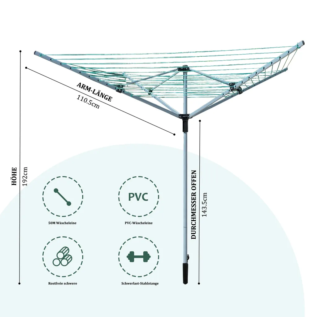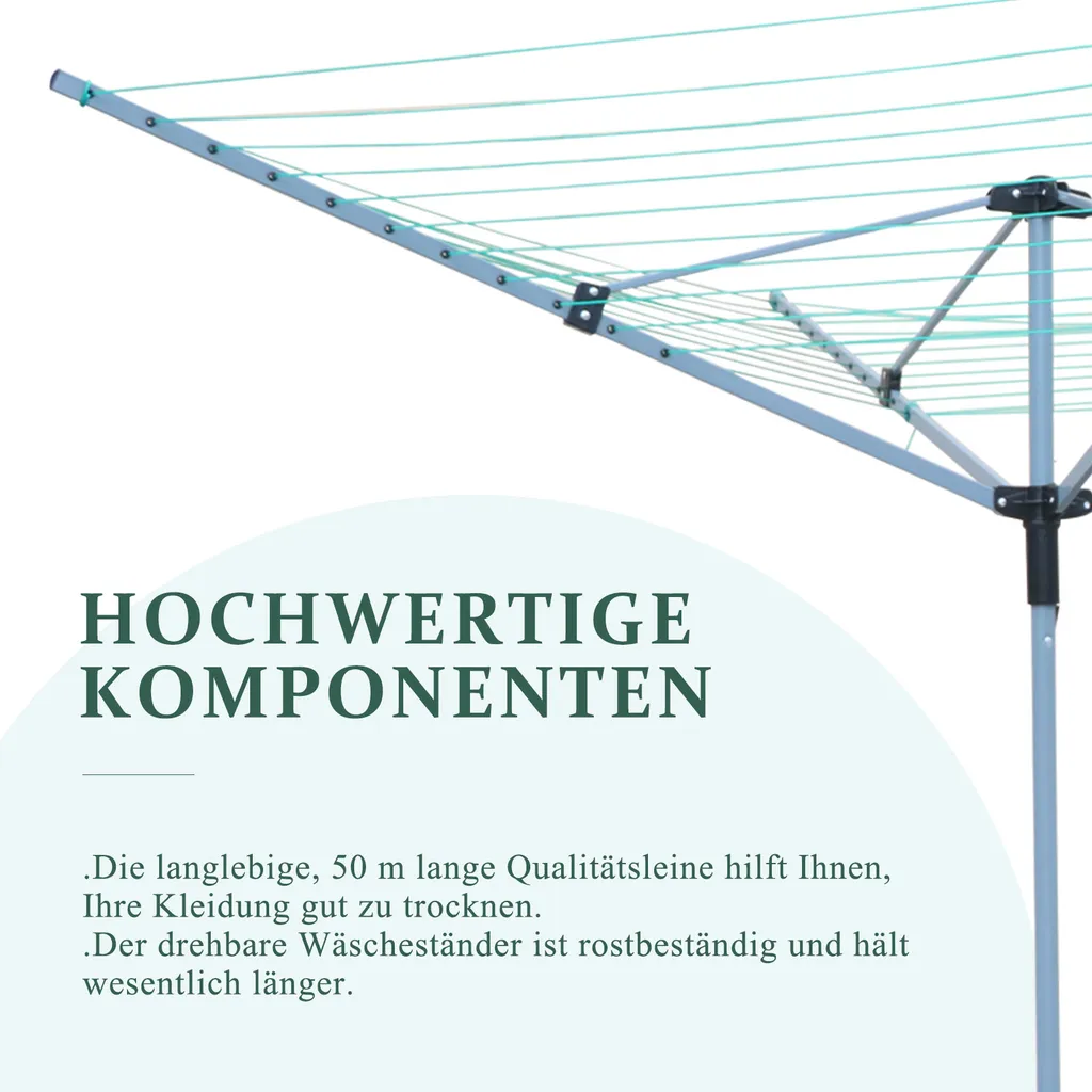 - Extra lange Wäscheleine: Wir bieten eine extra lange Wäscheleine von 50 m mit 11 verschiedenen Leinenlängen in vier Richtungen für große Familien.
