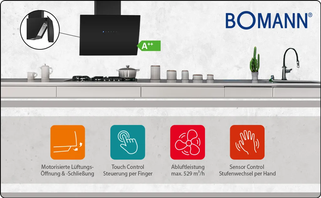 - Für mehr Freude beim Kochen — Die 60 cm Wandesse mit hochwertiger Glasfront DU 7605 G von Bomann für ein angenehmes Raumklima. Dank modernem Design ist die Dunstabzugshaube ein richtiger Eyecatcher in Ihrer Küche. Mit 3 Leistungsstufen und 529 m³/h Abluftleistung ist die Dunstabzugshaube von Bomann für alle Ansprüche gewappnet.