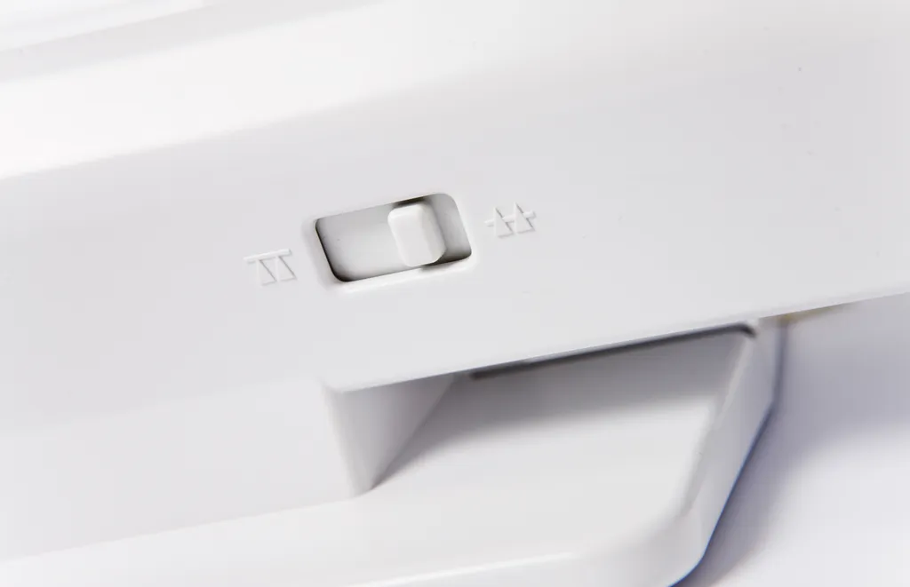 Nähfuß-Fixierung: Feststellfunktion für das kippfreie, waagerechte Gleiten über unterschiedlich starke Stofflagen und dicke Saumkanten.