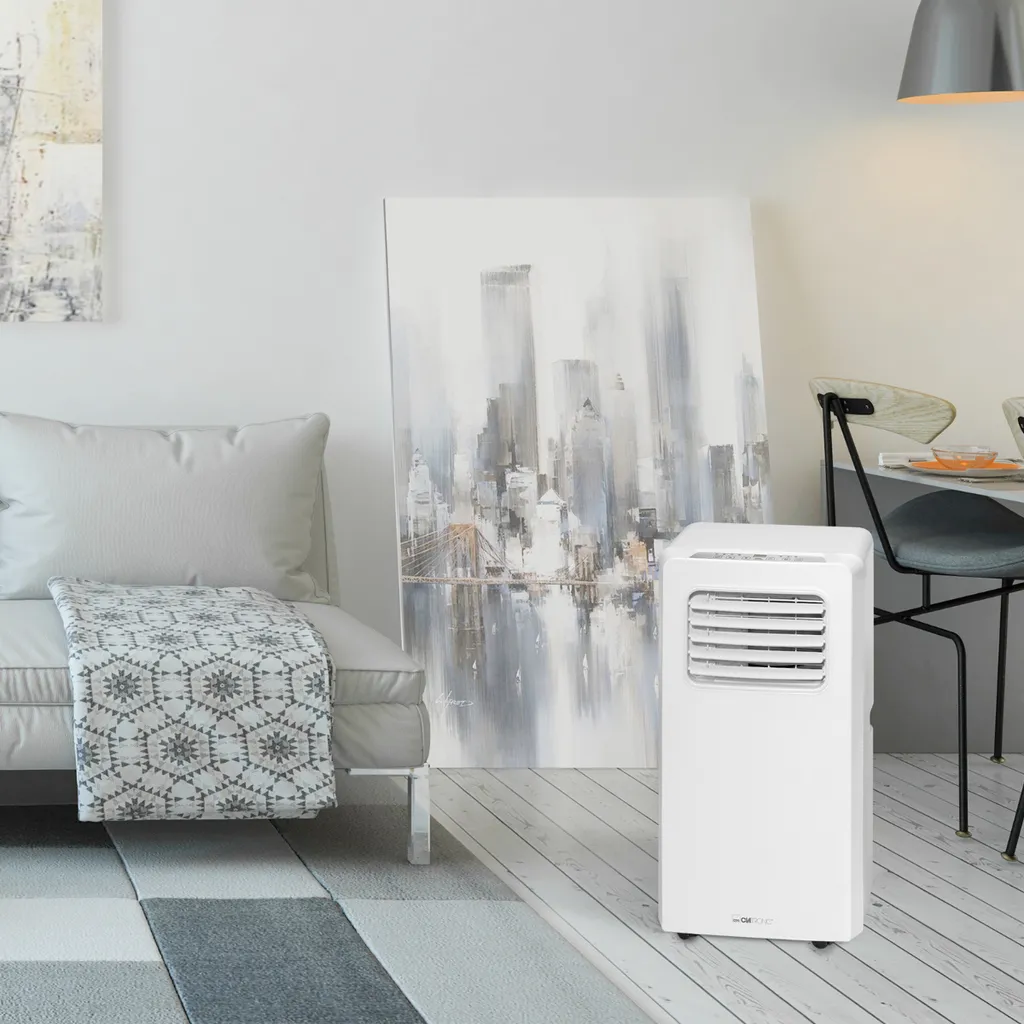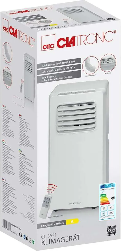 Wenn Sie nach einer flexiblen Klimaanlage für Ihre Familie suchen, dann ist dieses Klimagerät CL 3671 von Clatronic die beste Wahl für Sie. Diese mobile Klimaanlage ist speziell für den Hausgebrauch konzipiert. Dank seiner kompakten Bauweise mit Lenkrollen ist das Gerät beweglich und kann leicht herumgetragen werden. Die Klimaanlage verfügt über drei Betriebsmodi: Kühlen, Entfeuchten und Gebläse. Sie verfügt über 2 wählbaren Ventilatorgeschwindigkeiten und die Luftklappen können auch noch verstellt werden. Eine LED-Anzeige auf dem Bedienfeld zeigt Ihnen die Temperatur und den Timer an. Die Lieferung beinhaltet auch eine Infrarot-Fernbedienung (mit Batterien), einen 1,5 m langen Abluftschlauch und Fensterkit.