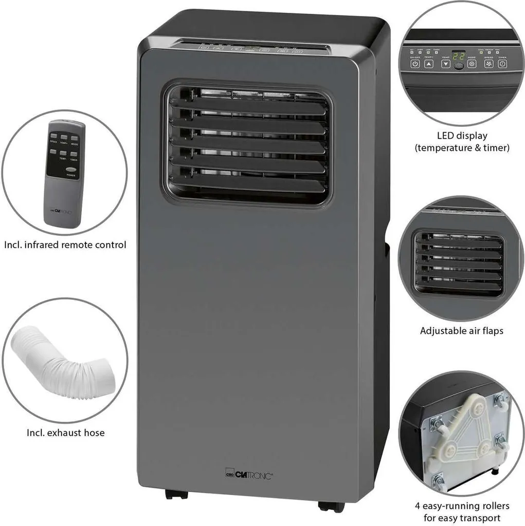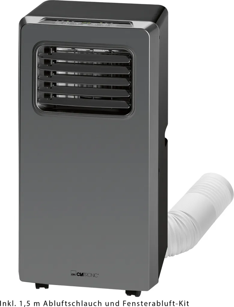 Wenn Sie nach einer flexiblen Klimaanlage für Ihre Familie suchen, dann ist dieses Klimagerät CL 3672 von Clatronic die beste Wahl für Sie. Diese mobile Klimaanlage ist speziell für den Hausgebrauch konzipiert. Dank seiner kompakten Bauweise mit Lenkrollen ist das Gerät beweglich und lässt sich leicht herumtragen. Die Klimaanlage verfügt über drei Betriebsmodi: Kühlen, Entfeuchten und Belüften. Sie verfügt über 2 wählbare Ventilatorgeschwindigkeiten und die Lüftungslamellen können auch noch verstellt werden. Eine LED-Anzeige auf dem Bedienfeld zeigt Ihnen die Temperatur und den Timer an. Die Lieferung beinhaltet auch eine Infrarot-Fernbedienung (mit Batterien), einen 1,5 m langen Abluftschlauch und Fensterkit.