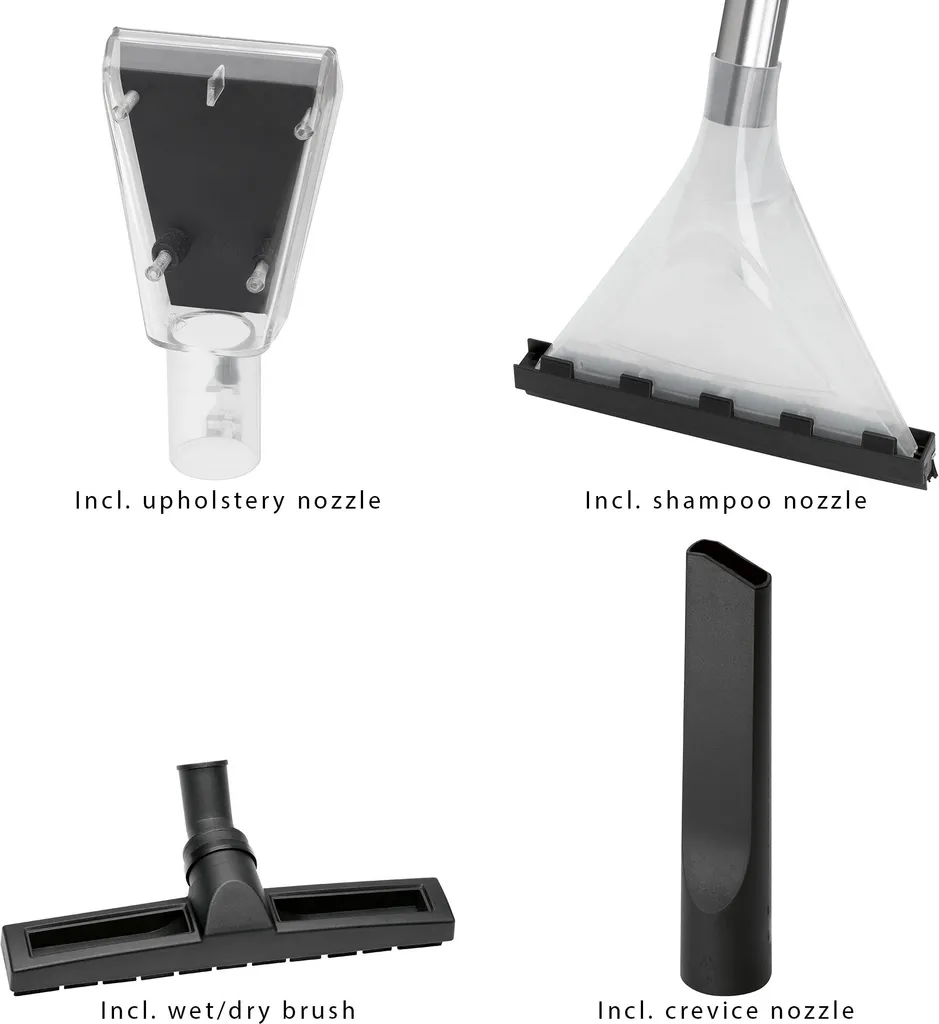 Das Zubehör umfasst eine Fugendüse, eine Parkettbürste, eine große und eine kleine Saugdüse. Der Nass-Saugbetrieb bietet ein Behältervolumen von 20 Litern, während der Reinigungsbehälter 4 Liter umfasst.