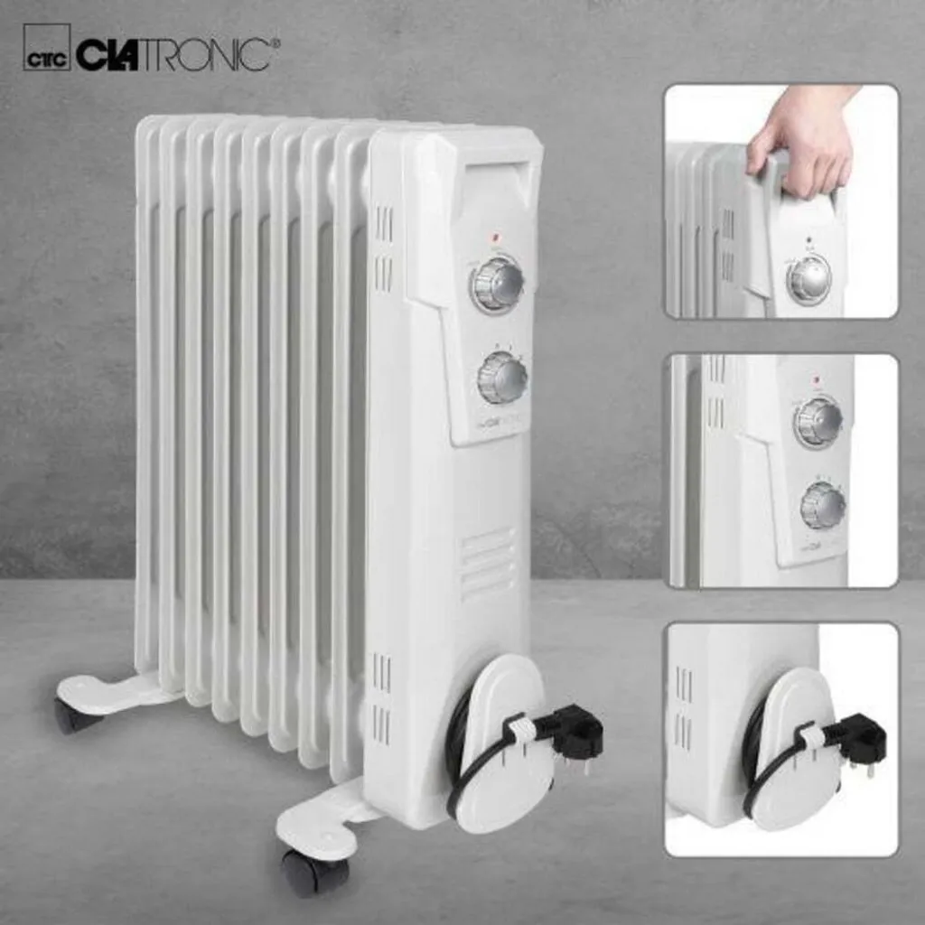 Clatronic RA 3736. Typ: Öl-Heizlüfter, Heizelement Typ: Öl. Geeignet für: Indoor, Platzierungsoptionen: Flur, Produktfarbe: Weiß. Heizleistung: 2000 W, Hitzeleistung (min): 800 W. Leistung: 2000 W, AC Eingangsspannung: 230 V, AC Eingangsfrequenz: 50 Hz. Breite: 640 mm, Tiefe: 250 mm, Höhe: 435 mm