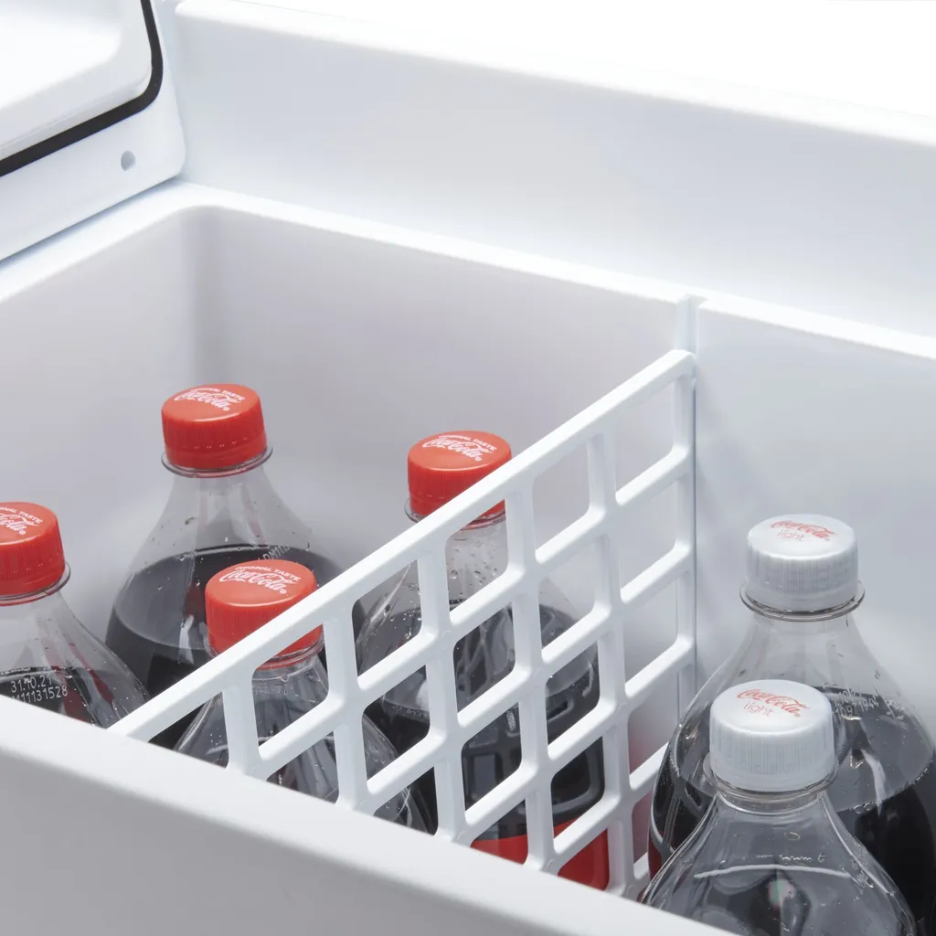 Kühlbox, einfacher Transport durch Rollen auf der Kühlbox und multifunktionaler Ausziehgriff. Der Innenraum bietet viel Platz entweder für 12 1,5-l Flaschen oder einen ganzen Kasten voll 0,5-l Flaschen. Der Deckel wurde geteilt, um einen minimalen Kälteverlust zu riskieren beim Öffnen der Kühlbox. Ein herausnehmbares Innengitter teilt die Box, um ihnen die Entscheidung zu geben, was sie wie Sortieren möchten.
