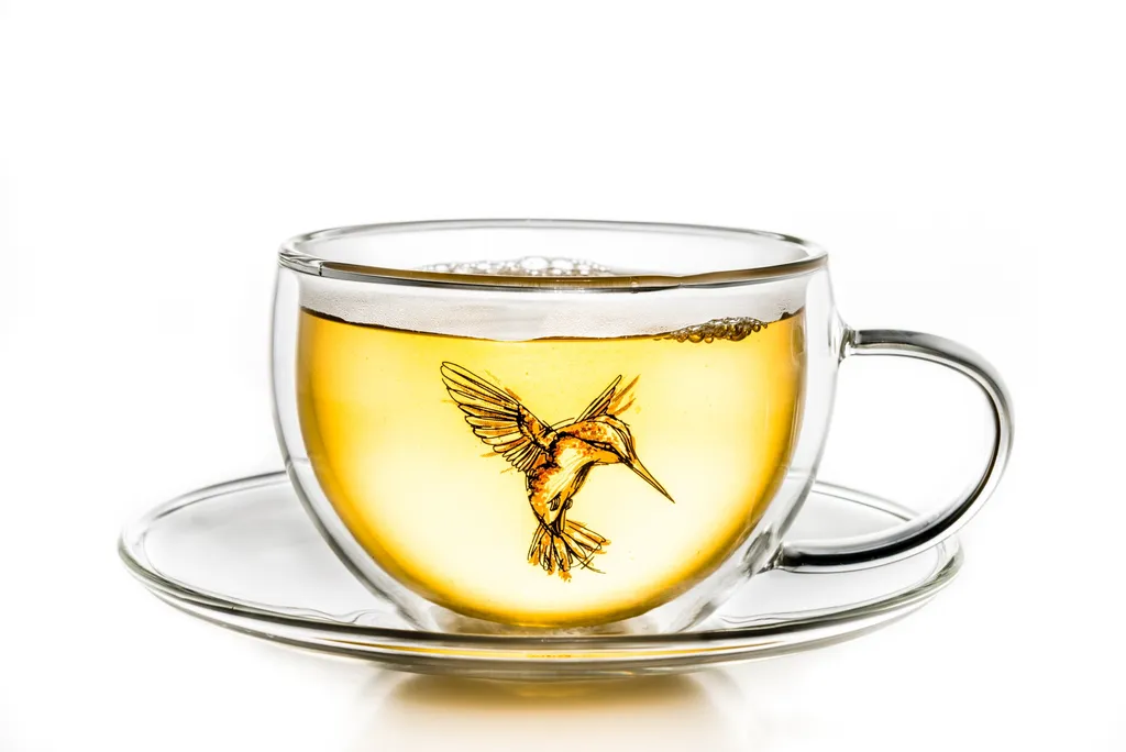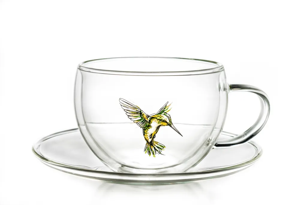Der faszinierende Kolibri befindet sich auf dem Innenglas, so dass dieser auch nach langem Gebrauch seine Schönheit behält. Zur Herstellung wird hitzebeständiges Borosilikatglas verwendet, das leicht und filigran ist, aber dennoch robust die hohen Anforderungen des Alltagsgebrauchs meistert. Dank des Isoliereffektes, ermöglicht durch die Luft zwischen den Glasschichten, bleiben Heißgetränke wie Kaffee oder Tee länger heiß und Kaltgetränke länger kalt. Zudem sorgt das Doppelwandglas für ein stets gleichmäßig temperiertes Außenglas, so dass auch ein mögliches Verbrennen der Finger der Vergangenheit angehört. Weiterer Effekt: kein Kondenswasser, somit keine Ränder auf dem Tisch beim Genuss von Kaltgetränken.