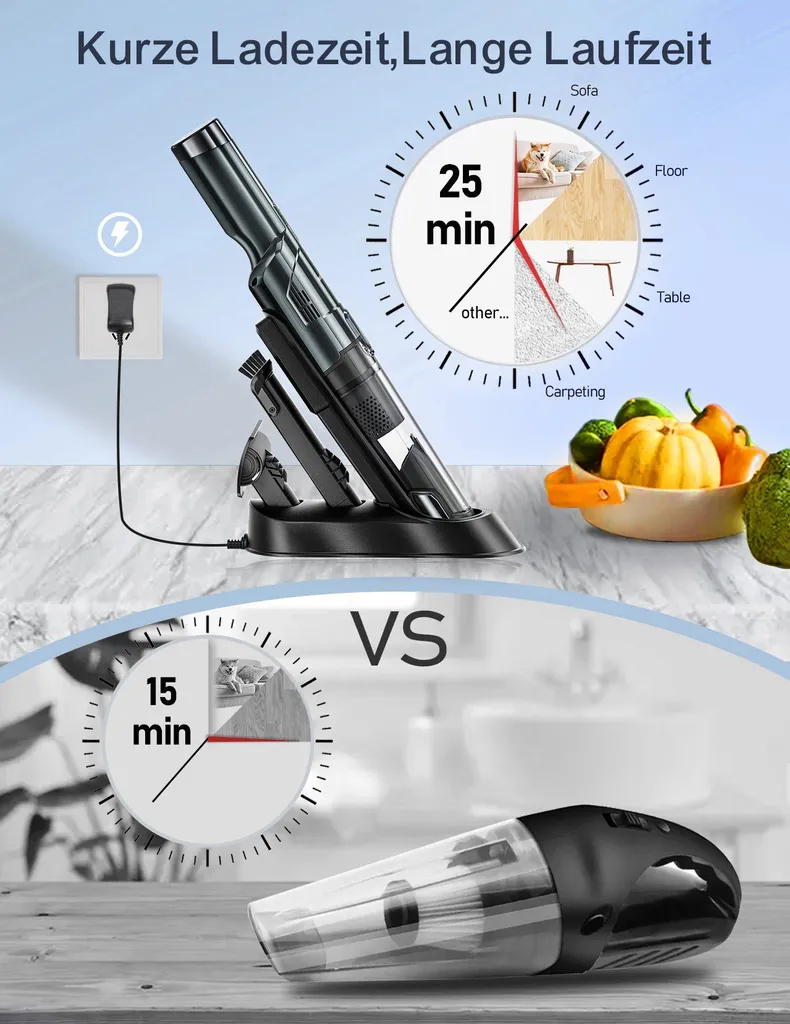 Der tragbare Staubsauger benötigt nur 4-5 Stunden zum vollständigen Aufladen. Dann kann es bis zu 25 Minuten ununterbrochen verwendet werden. Dies bietet ausreichend Zeit für eine gründliche Reinigung. Das Design der Ladestation bietet schnelle Aufladung und doppelte integrierte Zubehöraufbewahrung.