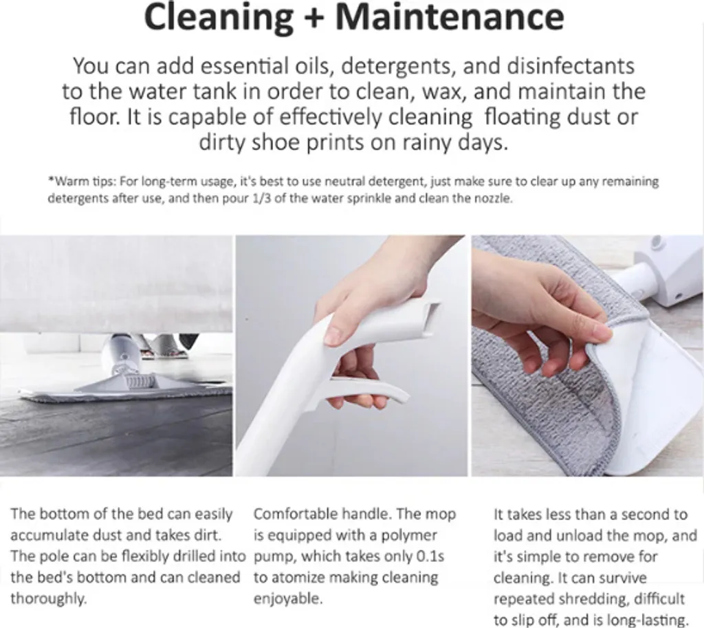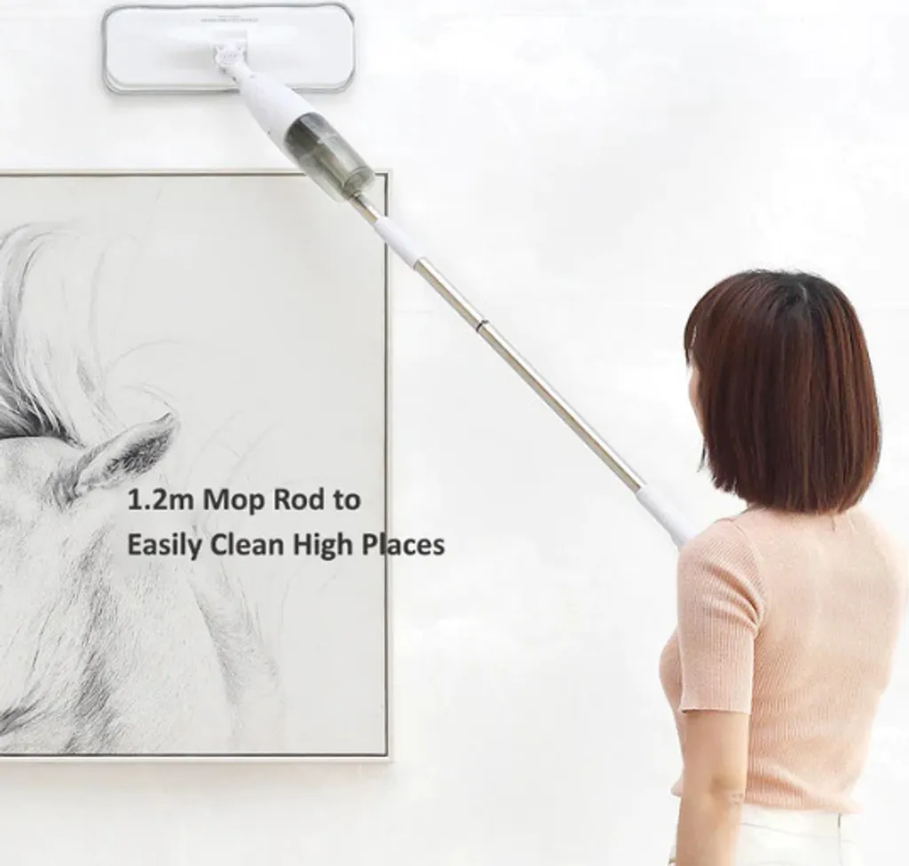 Flexibel genug, um auf Ecken und gepresste Bereiche wie unter dem Tisch, dem Sofa und dem Bett zuzugreifen. Sie brauchen keinen Strom. Außerdem müssen Sie keinen Eimer mit sich herumtragen, da der Mopp einen eingebauten 0,35-Liter-Wassertank.