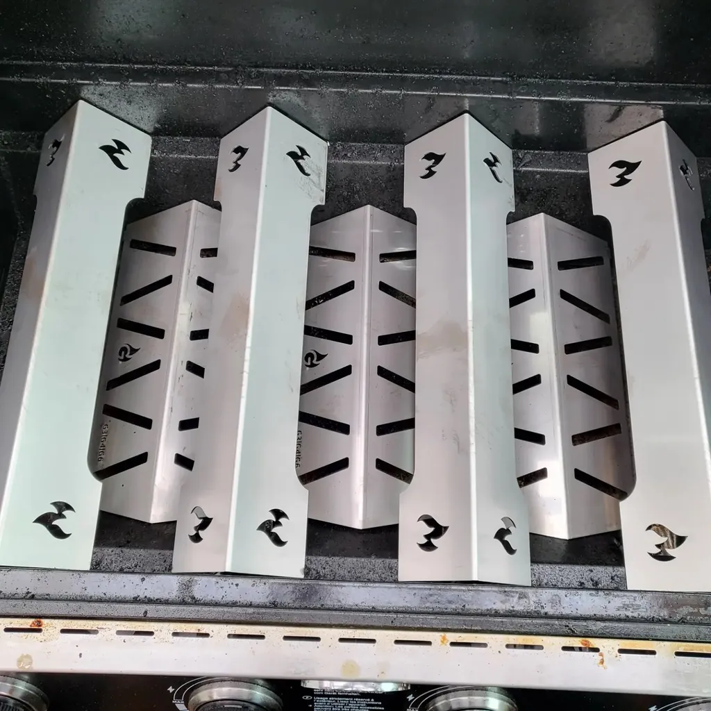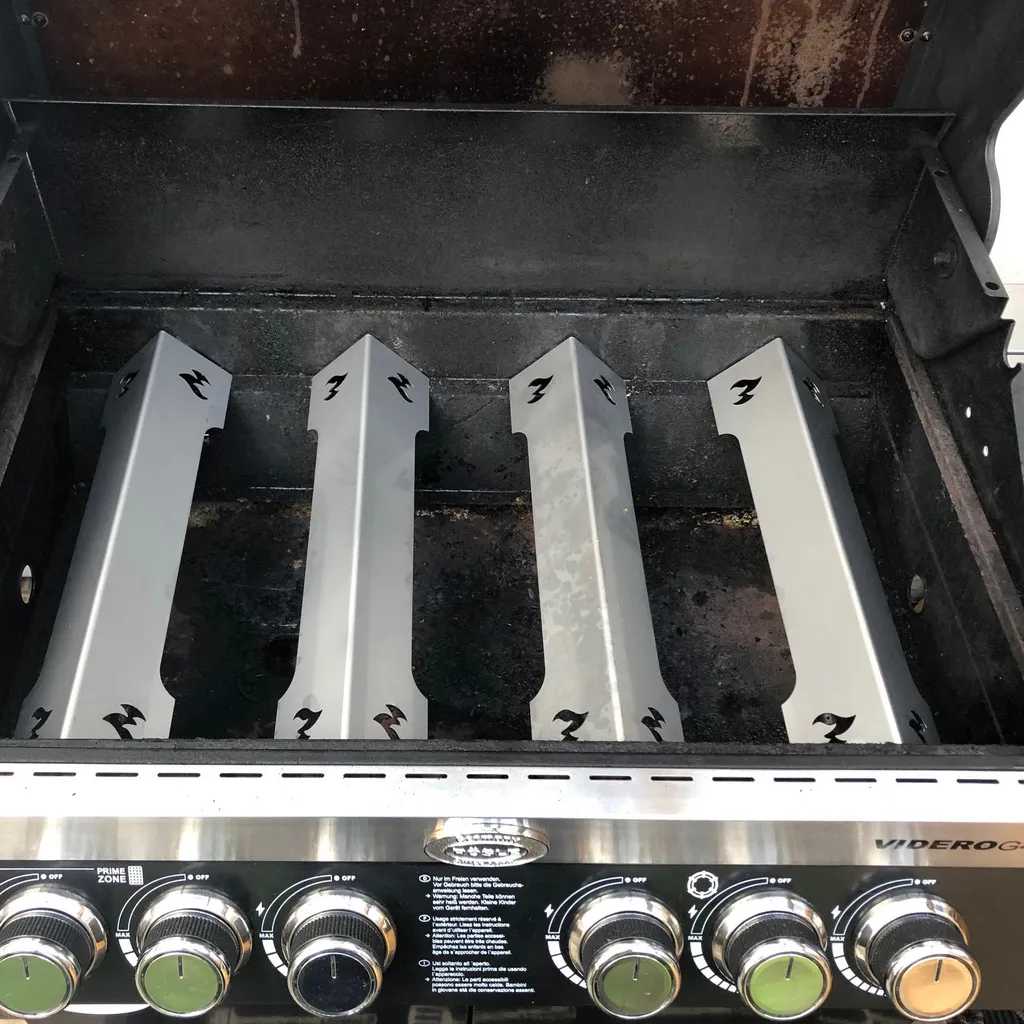 Unsere Brennerabdeckungen werden aus 1,5mm starkem Edelstahl Inox Material hergestellt und halten ein Leben lang. Die Wärmeverteiler werden mit vier großen Flammenöffnungen herstellt, durch die maximale Hitze ans Grillgut gelangt – stylisch und gleichzeitig nützlich. Natürlich kannst du unsere Brennerabdeckungen auch in die Spülmaschine packen.