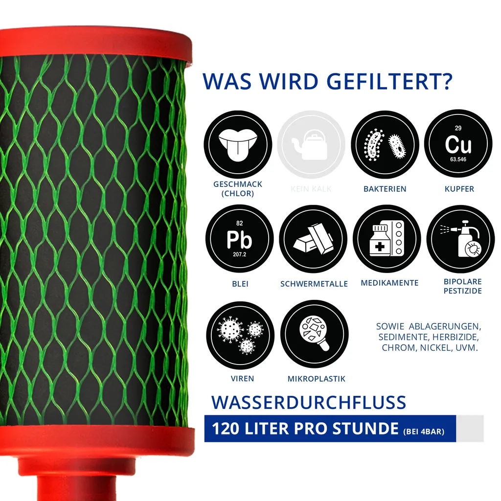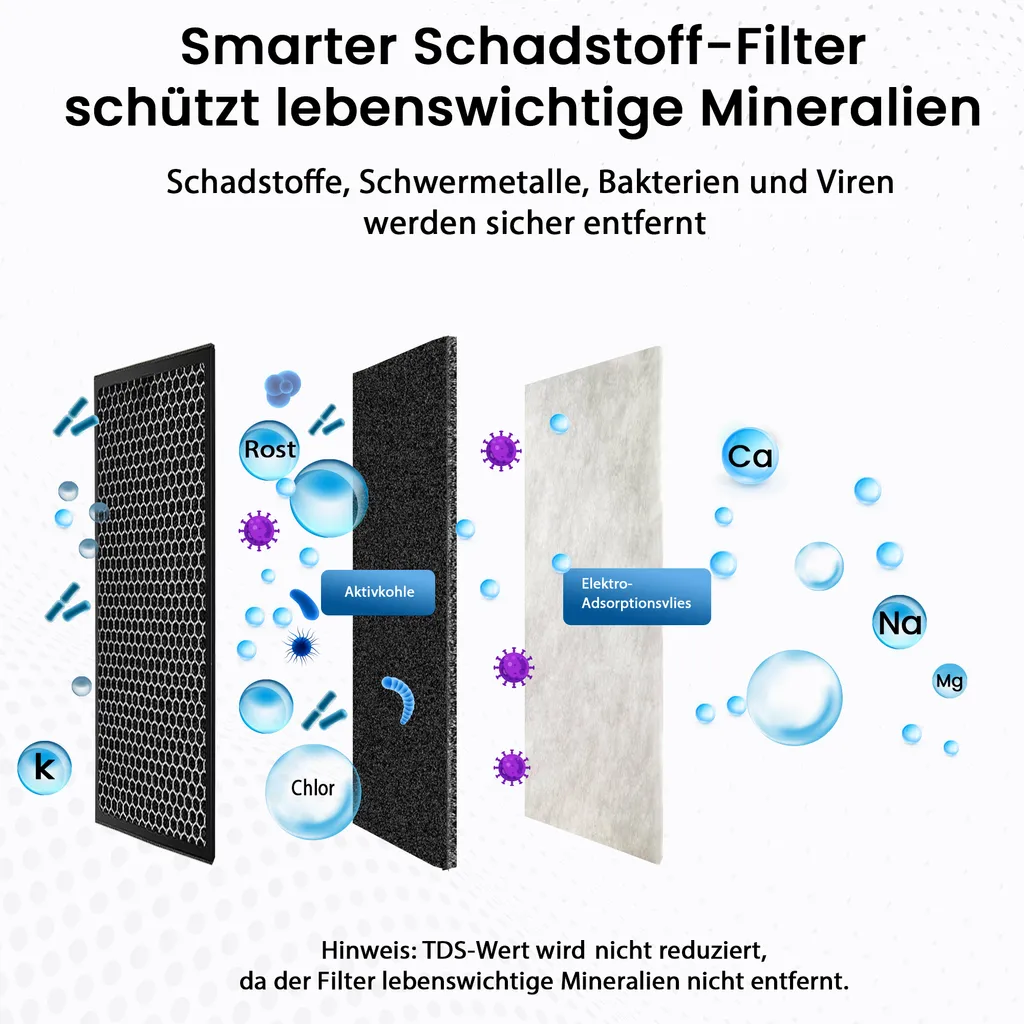 HOCHEFFIZIENT & INNOVATIV: Einzigartige Kombi aus in Katastrophen bewährter Aktivkohle und in der Raumfahrt genutzte Elektro-Adsorptionsfilter. Bakterien, Viren, Schwermetalle, Mikroplastik sowie unangenehmen Geschmack und Geruch werden gefiltert. Lebenswichtige Mineralien bleiben erhalten HOCHWERTIGER EDELSTAHL: Langlebig, Besonders hygienisch, bruch- und rostbeständig,