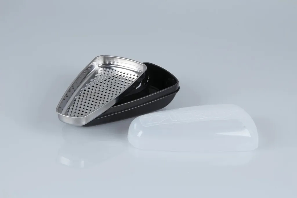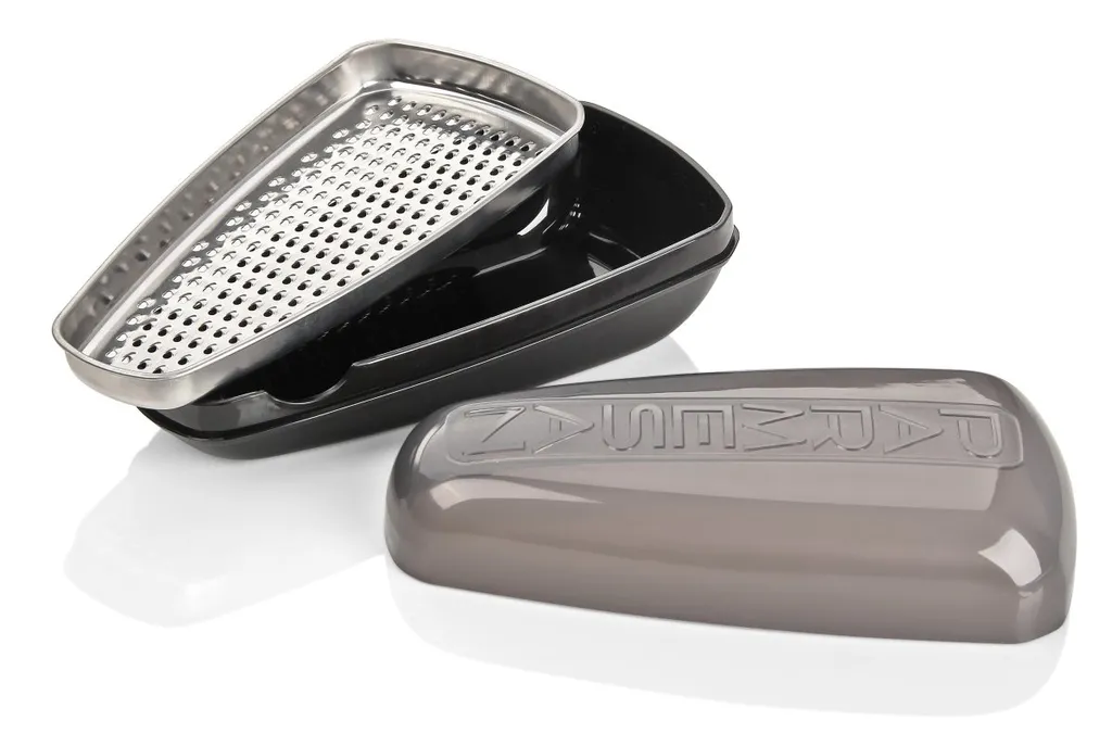 Die neue Parmesanreibe und Aufbewahrungsbox löst gleich zwei Probleme. Zum einen wohin man mit der Parmesanecke soll, nachdem man sie aus der Verkaufsverpackung entfernt hat. Einfach lose im Kühlschrank trocknet der Parmesan schnell aus, eingewickelt in Folie schwitzt dieser und wird schnell schlecht. Gelöst wird dieses Problem dadurch, dass die Box in Größe und Design an die handelsüblichen Parmesanecken angepasst wurde und diese somit bequem Ihren Platz in der Box finden. Die Box ist zudem nicht komplett luftdicht, so dass der Käse nicht das schwitzen beginnt und länger frisch hält. Zum anderen muss so ein Parmesaneck ja auch noch gerieben werden, bevor er Pasta und Co. verfeinern kann. Dafür ist in die Box eine Edelstahl-Reibefläche integriert, die das Reiben des Parmesans ganz einfach macht. Und sollte mal zu viel gerieben worden sein macht das auch nichts, denn im unteren Teil der Box kann der geriebene Parmesan ein wenig verweilen. Die Box hat ein schickes Design, so dass diese