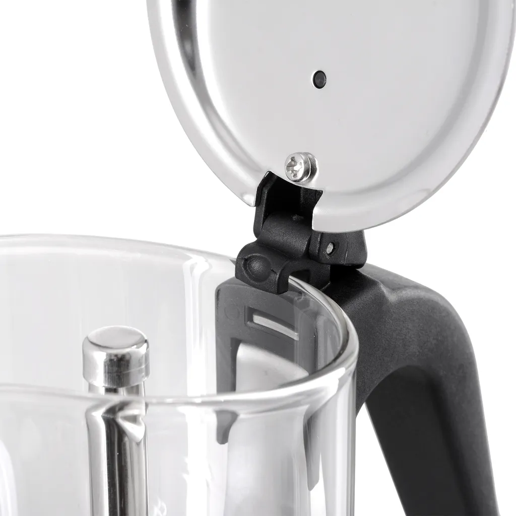 Die Glaskanne verfügt über einen praktischen Ausgießer und ist mit einer Ein-Finger-Bedienung zum Aufklappen des Deckels versehen. Der hitzebeständige Griff ist ergonomisch und schützt die Finger und Handflächen während Brühvorgang und beim Ausschenken vor Verbrennung.