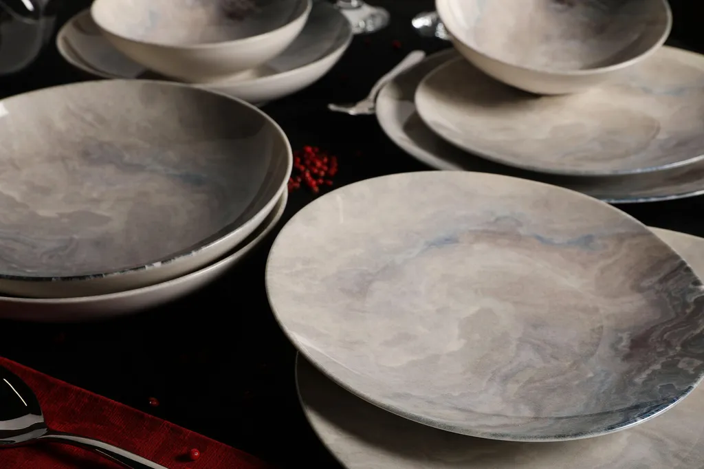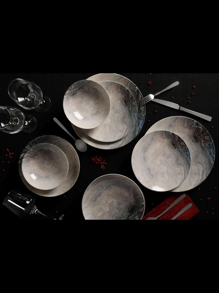 Mit diesem edlen 24-teiligen Tafelservice kannst du dein Abendessen auf stilvolle Weise servieren. Es besteht aus Speisetellern, Servierplatten und Schüsseln. Dieses Porzellanset bringt Leben in die Party und sorgt für Gesprächsstoff unter den Gästen. Das stilvolle blaue Design ist dank des kratzbeständigen und bruchsicheren Materials sehr langlebig.