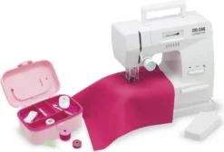 Nähmaschine für Kinder. Lassen Sie die kleine Näherin lebendig werden und kreieren Sie verschiedene kreative Kreationen. Die Nähmaschine hat ein Fußpedal und verschiedene Funktionen, genau wie eine echte Nähmaschine. Zum Beispiel die Zick-Zack-Funktion, 2 Geschwindigkeiten und Rollen. Enthält eine schöne Tasche mit Zubehör für die Nähmaschine, die u.a. Draht, Spulen und Maßbänder. Benötigt 4 x 1,5 V LR6 / AA-Batterien (nicht im Lieferumfang enthalten). Ab 6 Jahren.