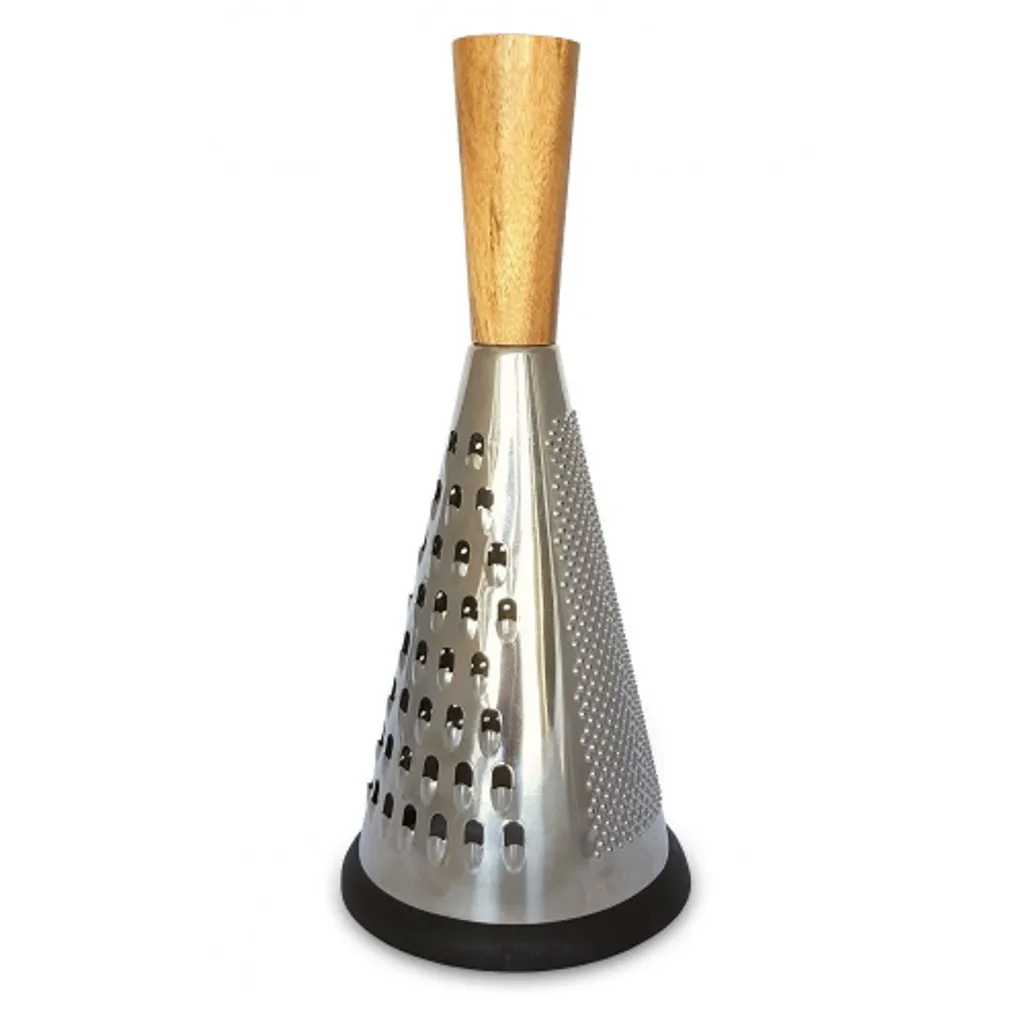 Stahlreibe mit Akazienholzgriff und rutschfestem Boden. Hergestellt im Stanzprozess, was zu einer außergewöhnlichen Schärfe der Schneidelemente und einer glatten Rückseite führte, die ein Verstopfen verhinderte Sie können wählen: hacken, fein, grob und sehr grob …