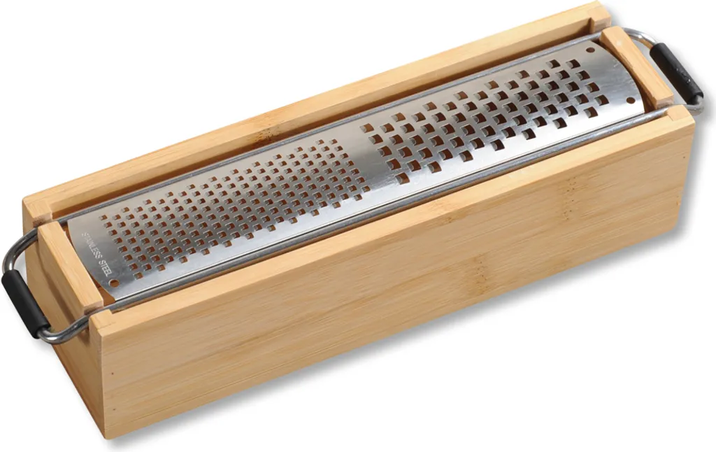 Die Kesper Küchenreibe mit einem Behälter aus Bambusholz ist ein praktisches Utensil.