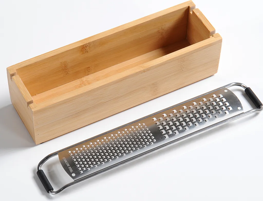 Produktdetails: Reibe mit Auffangbehälter, geeignet für Käse, Gewürze, Obst, Schokolade etc. Maße: Länge: 25cm Breite: 6,2cm Höhe: 5,6cm Lieferumfang: 1x Reibe mit Behälter – Bambus Eventuell vorhandene Dekorationsartikel sind nicht im Lieferumfang enthalten.