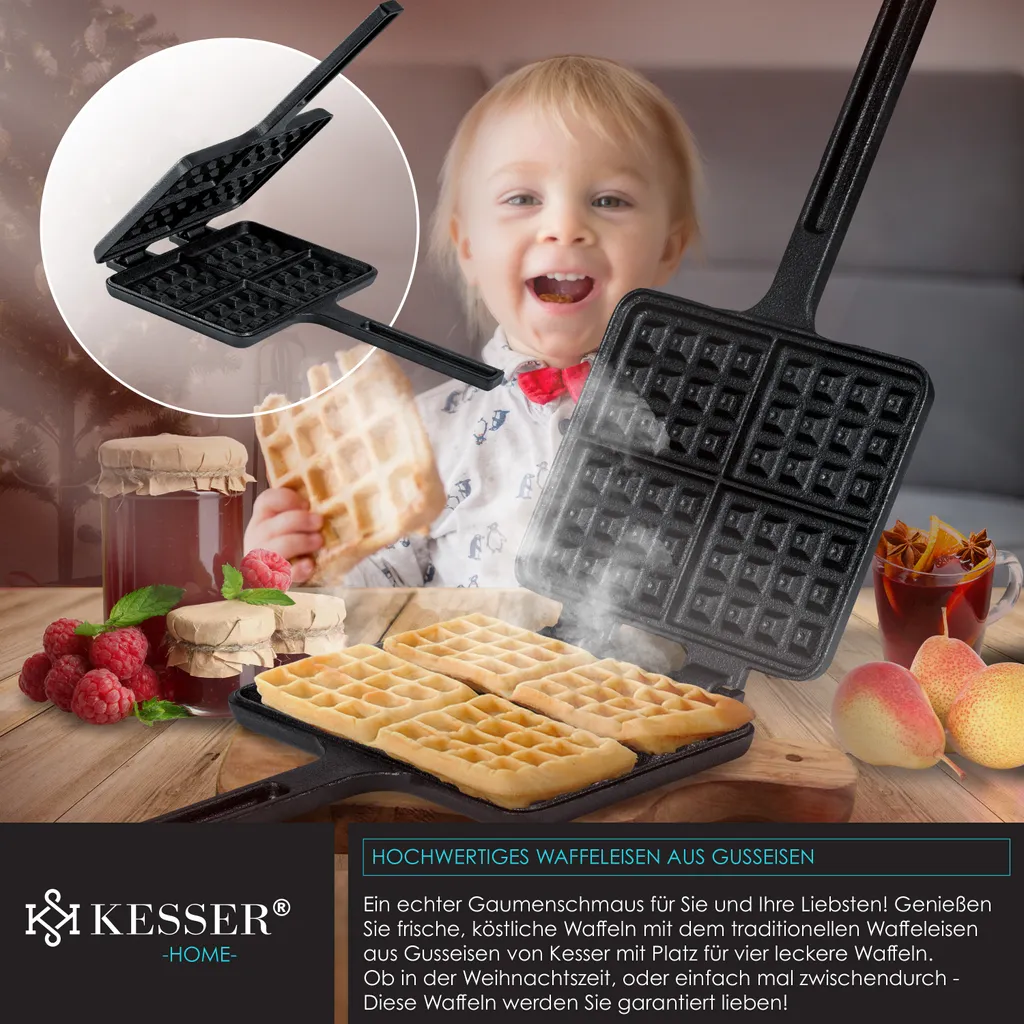 NUR FÜR DAS 12-TEILIGE SET: Ein echter Gaumenschmaus für Sie und Ihre Liebsten! Genießen Sie frische, köstliche Waffeln mit dem traditionellen Waffeleisen aus Gusseisen mit Platz für vier leckere Waffeln.