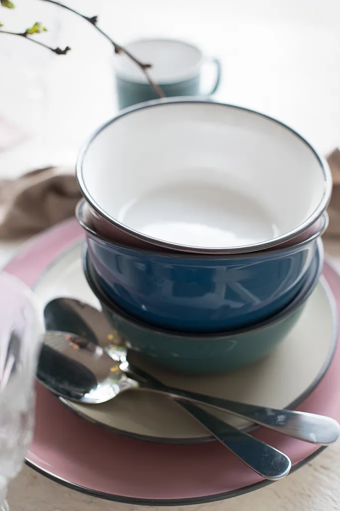 Herbstliche frische Farben und originelle, an traditionelles Emaille-Geschirr angelehnte Formen sorgen für gute Laune, der dunkel abgesetzte Rand zugleich für klare Linien. Je nach Stimmung und Bedarf kombinieren Sie mit Maila die vier sorgfältig aufeinander abgestimmten verfügbaren Farben altrosa, dunkelblau, petrol und beige zu einem harmonischen Ensemble.