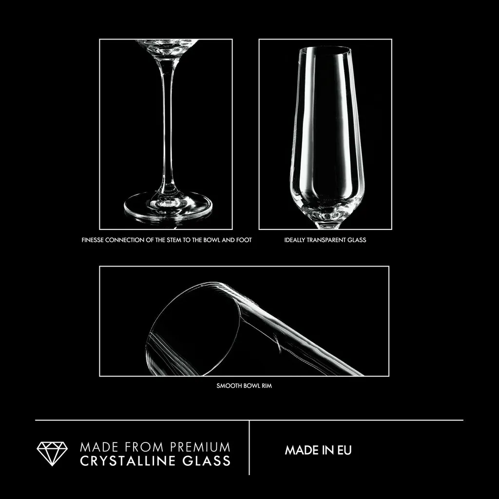 6-GLÄSER SET – Champagnergläser eignen sich perfekt für die Verkostung edler Getränke. Die feine Verbindung des Stiels mit dem Kelch und dem Fuß verzaubert die Liebhaber von Minimalismus und eleganter Schlichtheit.