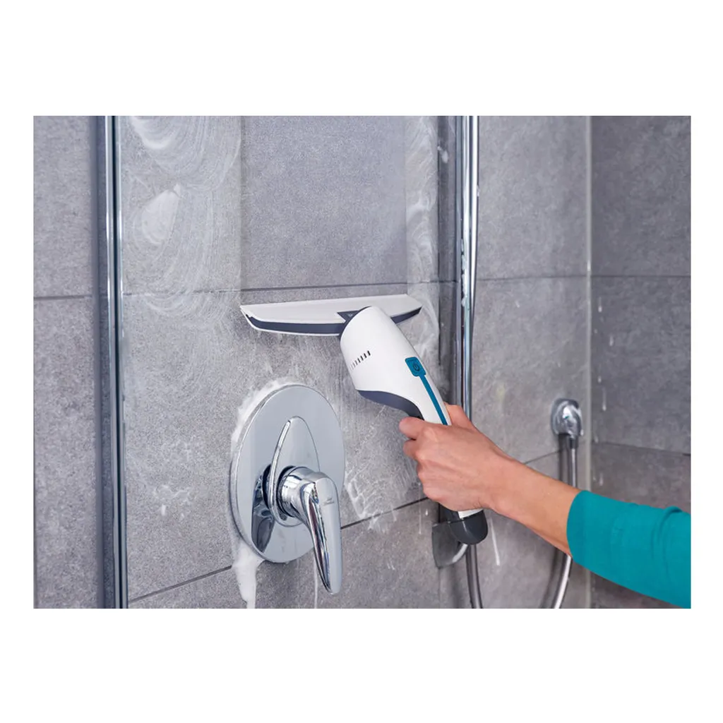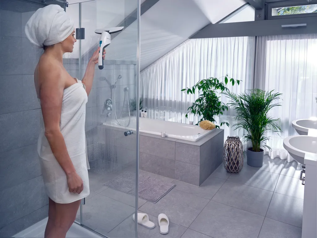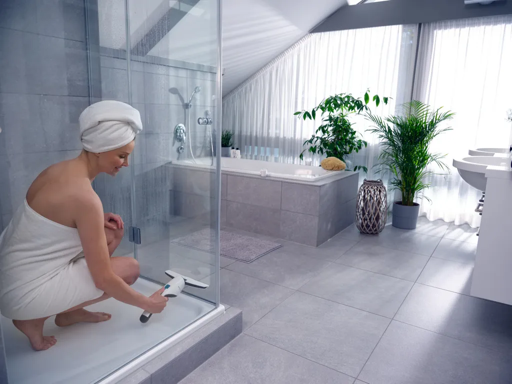Sie saugt Wischwasser und Kondenswasser zuverlässig von Fliesen, Spiegeln und der Duschkabine.