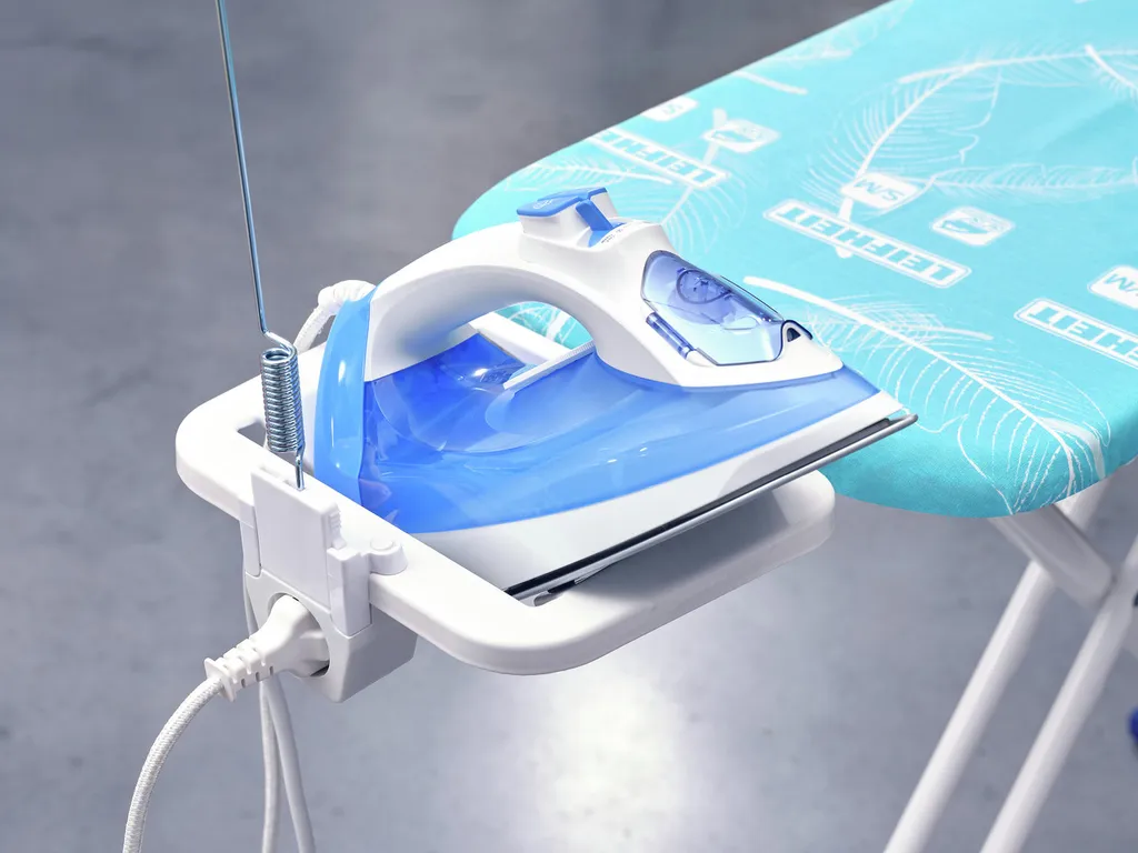 - Feste Bügeleisenablage mit Kabelhalter und Steckdose für sicheres Abstellen des Bügeleisens