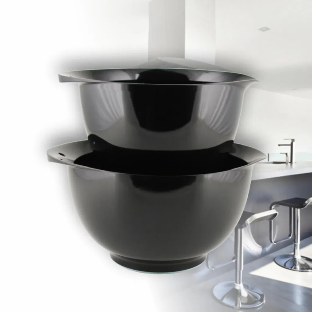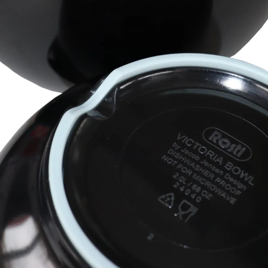 ROSTI Schüssel 2-er Set VICTORIA schwarz ca 2+3LMit diesen durchdachten Rührschüsseln macht das Kochen & Backen spaß! Außerdem gibt das hohe Gewicht, wie der Anti-Rutsch-Ring einen stabilen Stand. Die Drainagekanäle am Boden/im Standfuß verhindern, dass sich Wasser beim Spülvorgang ansammeln kann. Auch eine hohe Kratzfestigkeit ist wieder gegeben.IIm Lieferumfang enthalten: 1 Stück 2L Schüssel, 1 Stück 3L Schüssel by Jacob Jensen DesignMaterial Schüsseln: MelaminMaße der 2er: ca.13 x24 x 20 cm (HxLxT)Maße der 3er: ca.13,5 x27,5 x 23 cm (HxLxT)Fassungsvermögen Schüsseln: 1x ca. 2 Liter, 1x ca. 3 LiterHinweis: spülmaschinenfest – nicht mikrowellengeeignet – nicht im Gefrierschrank verwenden – BPA-frei – lebensmittelecht – kratzfestMelamin-Schüssel mit verstärkten Seiten, Ausguss und Griff | hitzebeständig bis 70 Grad | optimale Standsicherheit durch Anti-Rutsch-Ring | zwei Abflusskanäle im Fuß, sodass nach dem Waschen in der Spülmaschine kein Wasser stehen bleibt | Loch im Griff zum Aufhängen für die AufbewahrungDieses gilt für ein 2-er Set VICTORIA Schüsseln aus Melamin in der Farbe schwarz, Fassungsvermögen 1x ca. 2L, 1x ca. 3L, Artikel RO-24832, OHNE Deko oder sonstiges Zubehör.