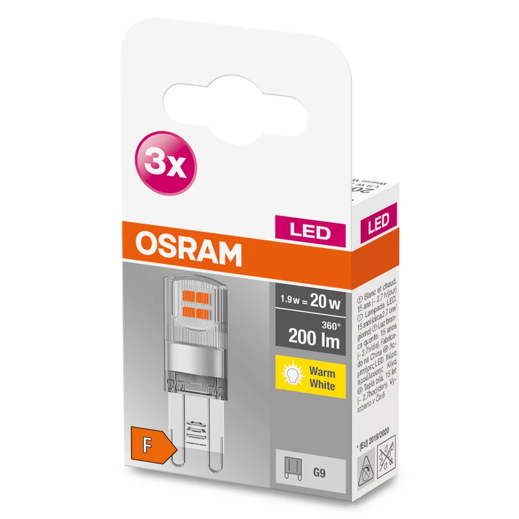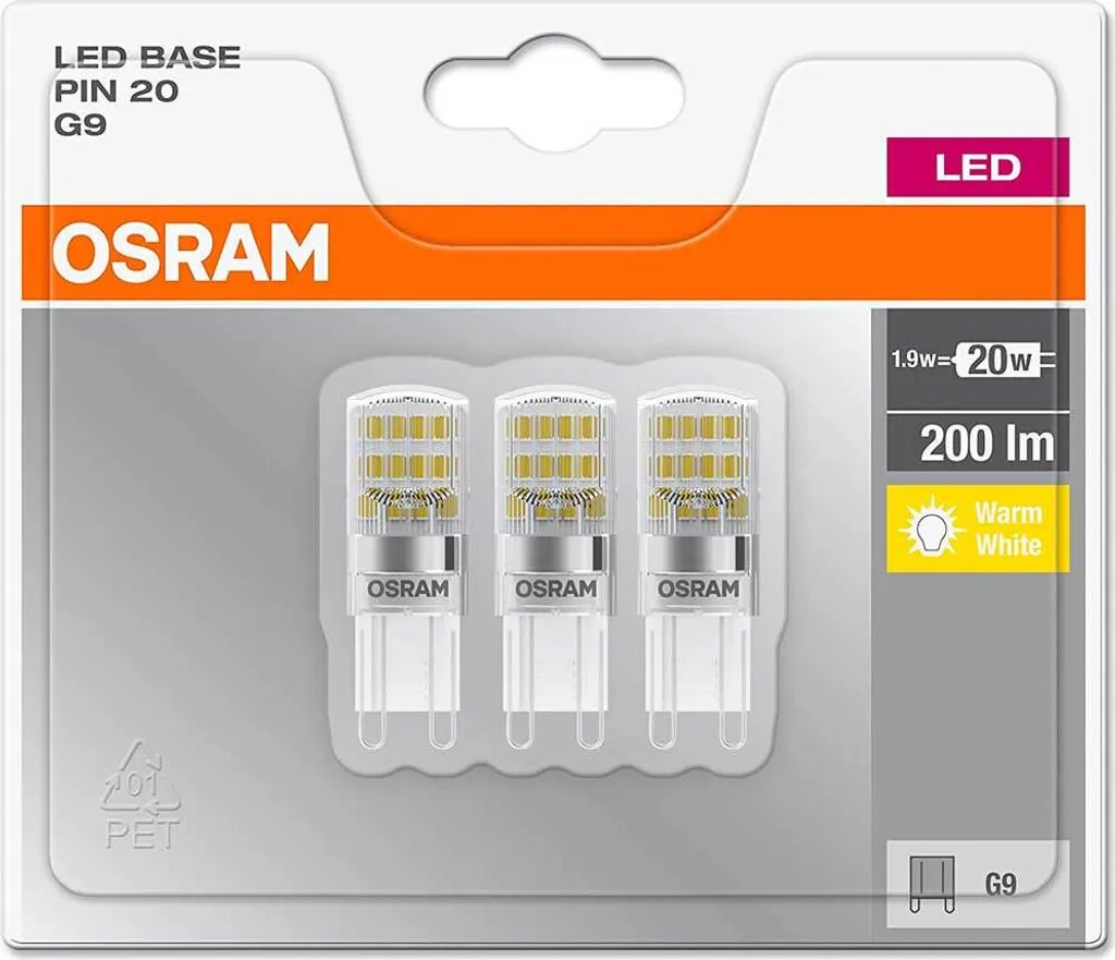 3 Osram Base PIN LED-Leuchtmittel, G9, 1,9 W (20 W), 200 lm, warmes Licht (2700 K)