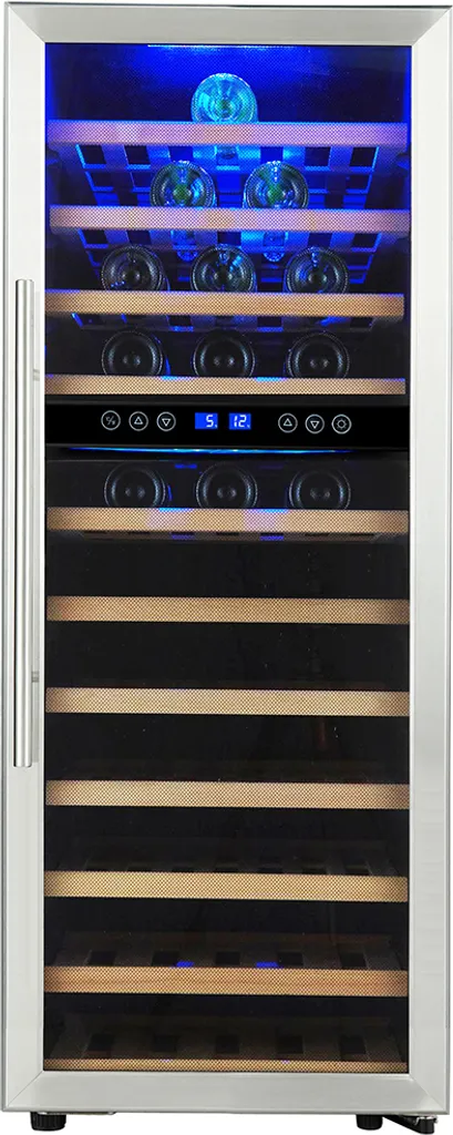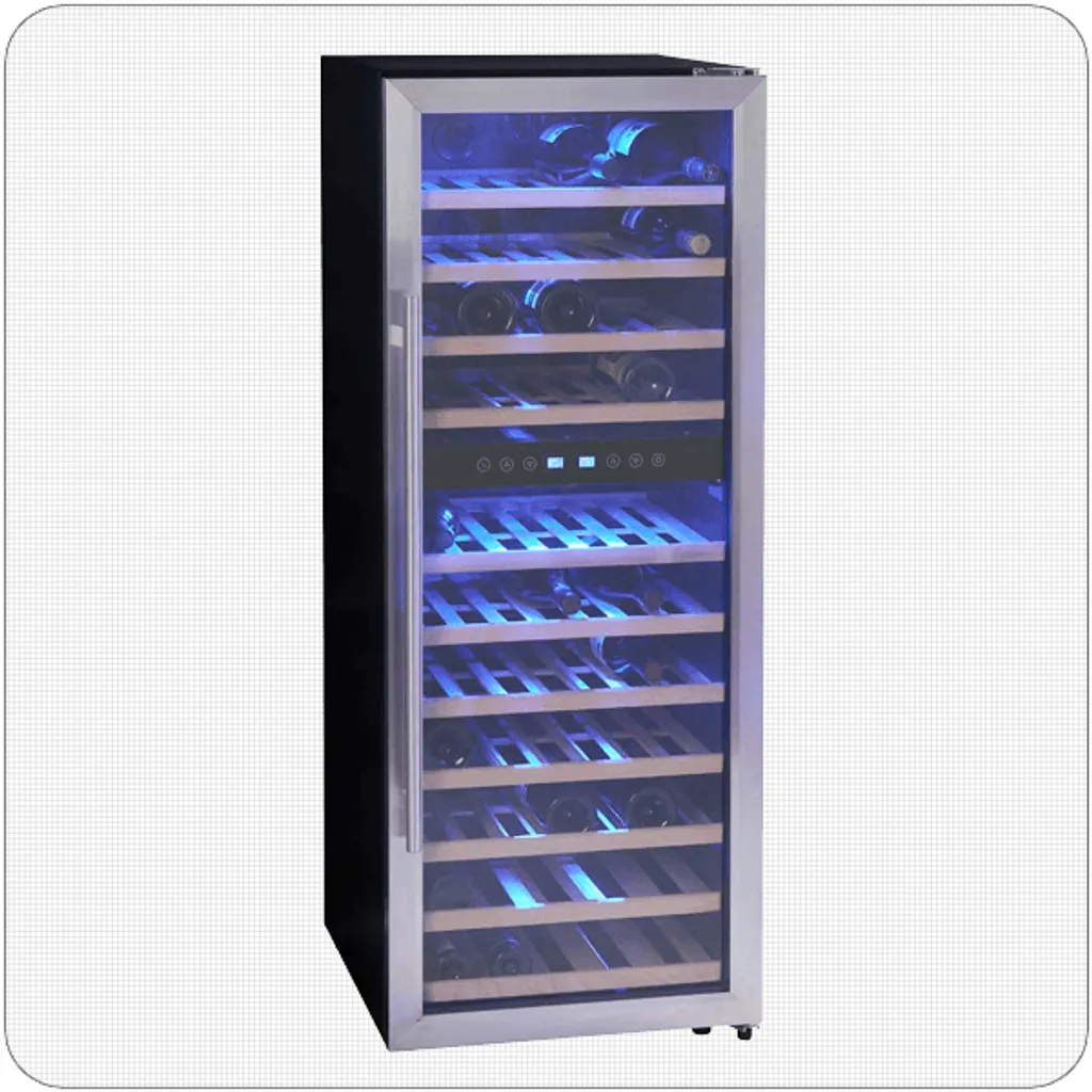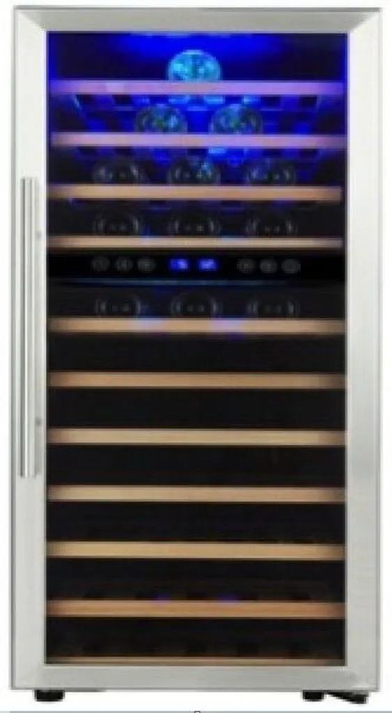 Der moderne Weintemperierschrank WKS72B ist ideal für das Kühlen von Wein und überzeugt zudem mit stilvoller, blauer Innenbeleuchtung sowie einer Tür aus Sicherheitsglas. Die Temperatur lässt sich von 5 °C bis 10 °C sowie von 10 °C bis 18 °C über Touch Control variieren und wird über das digitale LC-Display angezeigt. Im Innenraum ist auf 11 Holzböden Platz für bis zu 72 Weinflaschen. Der Weintemperierschrank misst ca. 49,5 x 127,5 x 58 cm und dank verstellbarer Füße vorne ist auch das Justieren für einen sicheren Stand kein Problem.