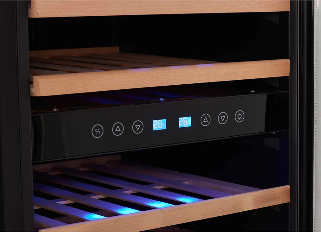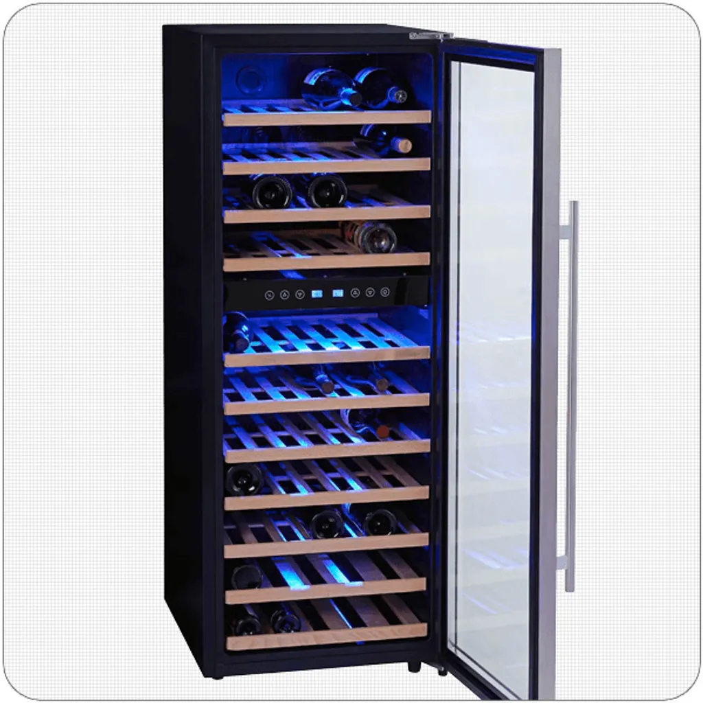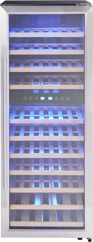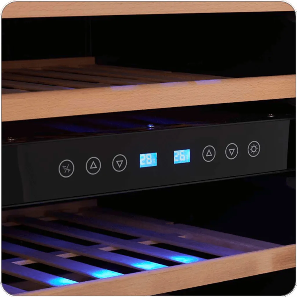 Der Weinkühlschrank in schwarzer Grundfarbe mit Edelstahl-Türrahmen überzeugt mit 11 edlen Holzeinlegeböden, auf denen 73 Flaschen Platz finden können, und einer stilvollen blauen LED-Kühlraumbeleuchtung. Zudem verfügt er über ein regelbares Thermostat, 2 höhenverstellbare Füße, einem großen Edelstahlgriff und einem Touch Display.