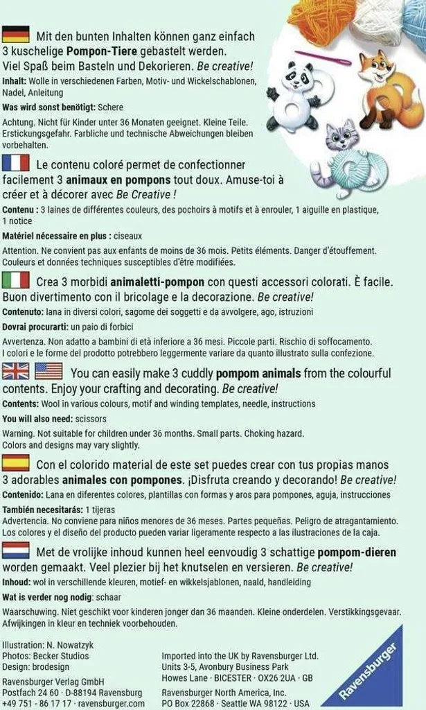 Mit dem Ravensburger Be Creative Set Pompon-Tiere können Kinder ab 6 Jahren aus der im Kreativset enthaltenen Wolle und den Wickelschablonen kugelrunde und kuschelige Tiere basteln. Das Set enthält alle Materialien die für 3 Pompon-Tiere benötigt werden. Einfach Wolle um die bunten Pappschablonen wickeln und aufschneiden – schon kann mit den lustigen Tierchen gespielt werden. Neben der Kreativität und Fingerfertigkeit wird auch die Fantasie der Kinder gefördert.