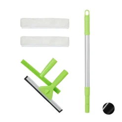 Es ist mal wieder an der Zeit, sich um den Hausputz zu kümmern? Mit diesem Fensterreinigungsset sind Sie für die professionelle Reinigung Ihrer Fenster bestens ausgestattet. Das 5-teilige Set, bestehend aus Einwascher, Abzieher, 2 Bezügen und einer Teleskopstange gibt Ihnen die Möglichkeit, gründlicher denn je zu arbeiten. Einfach einen Bezug über den Einwascher ziehen, die Fensterscheibe gründlich einseifen und anschließend mit dem Abzieher das Wasser samt Schmutz an den Rand schieben. Der ausziehbare Stiel hilft Ihnen auch höher gelegene Stellen problemlos und ohne gefährliches Klettern zu erreichen.