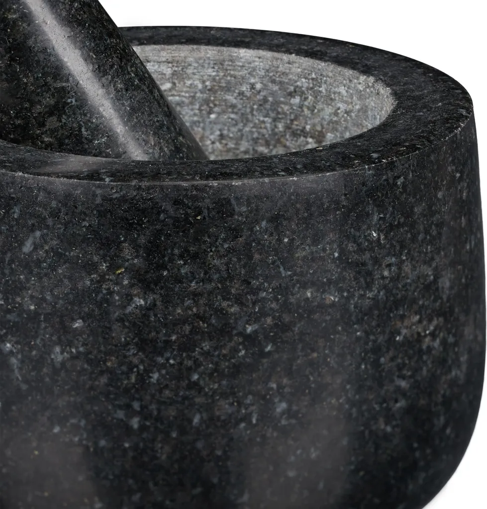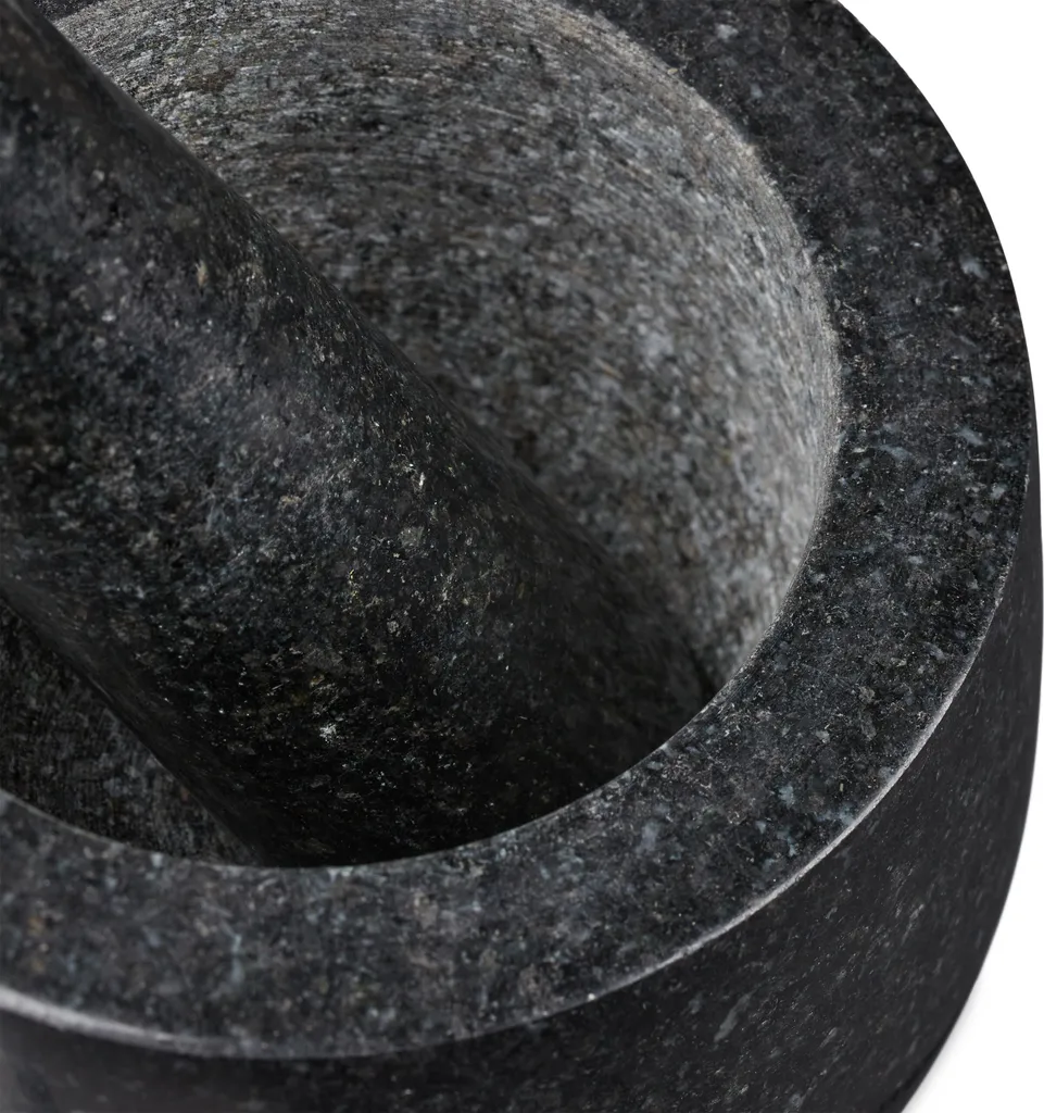 Hinweis: Granit ist ein Naturprodukt. Der Mörser kann daher in Körnung, Farbton und Struktur variieren und leicht von den Produktbildern abweichen. Vor dem ersten Gebrauch mit Wasser abspülen und ggf. grobes Salz mörsern, um produktionsbedingten Abrieb zu entfernen.
