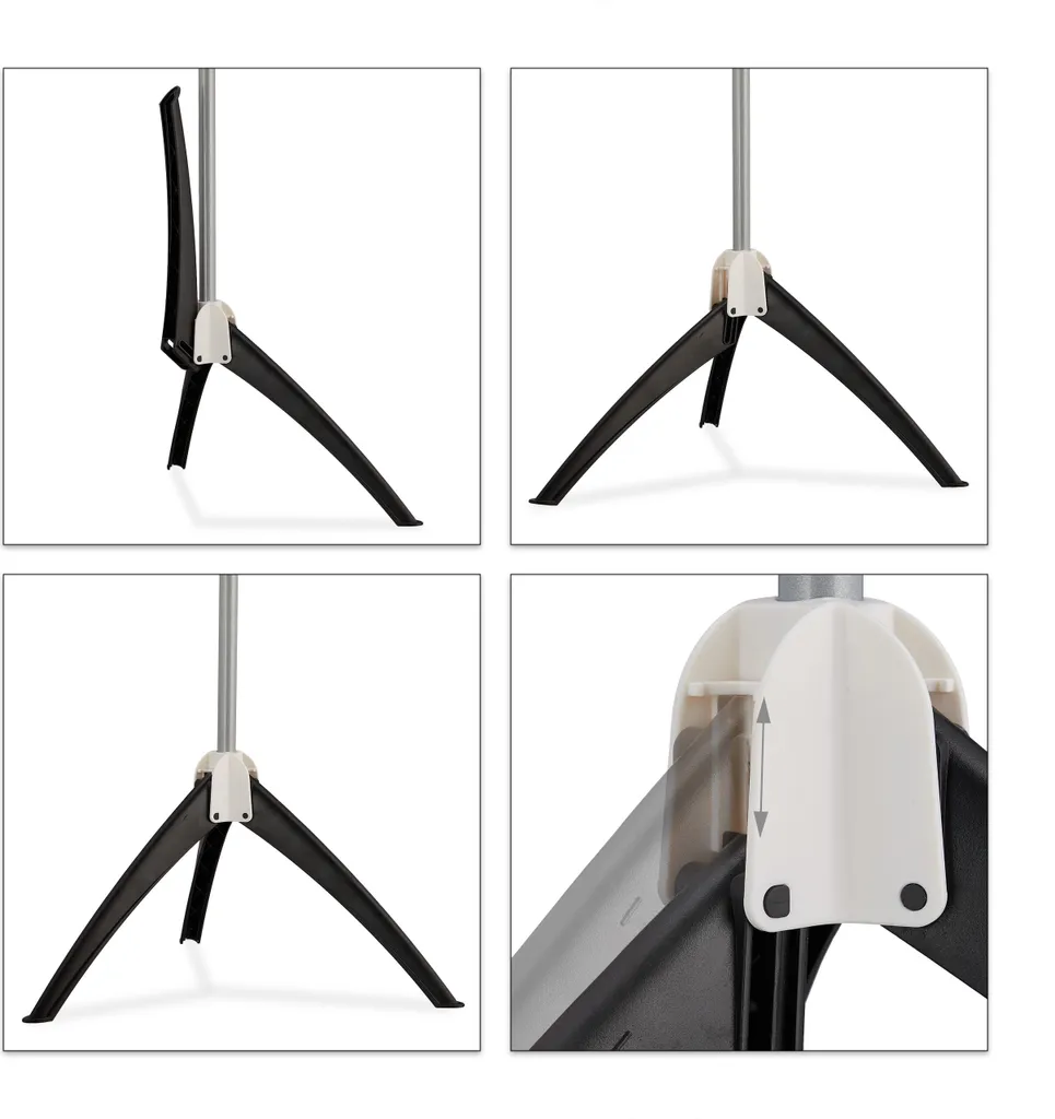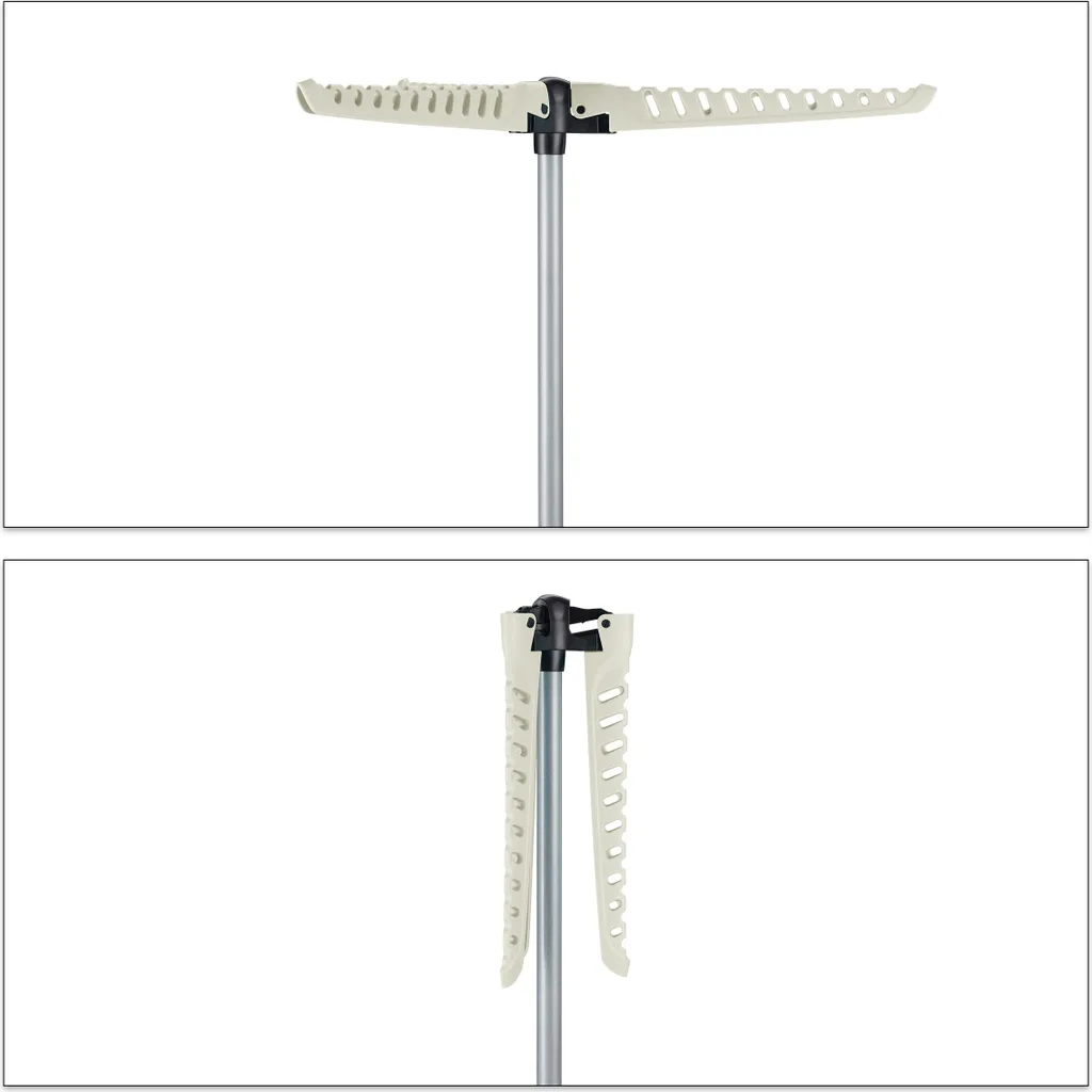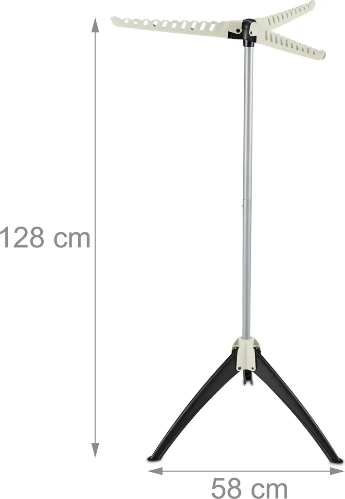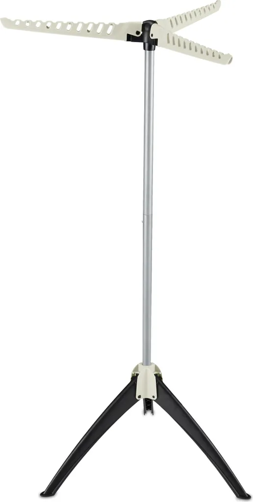 Mithilfe des Hängewäscheständers trocknen Sie Hemden, Blusen oder kurze Kleider faltenfrei. Der faltbare Wäschetrockner steht stabil auf 3 Beinen. Die 3 Arme des hohen Hemdentrockners bieten für bis zu 33 Kleiderbügel zugleich Platz. Dank der vielseitigen Aufhängung in Löcher oder Kerben finden Bügel aller Art – ob Kleider- oder Hosenbügel – sicheren Halt. Der platzsparende Faltkleiderständer ist für drinnen und draußen geeignet und dank seines geringen Gewichts auch ideal auf Reisen.