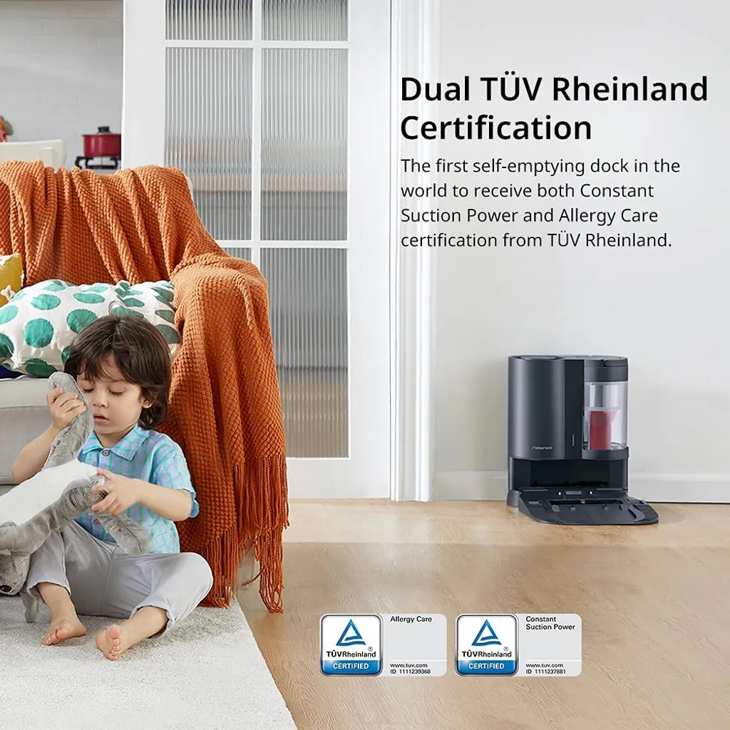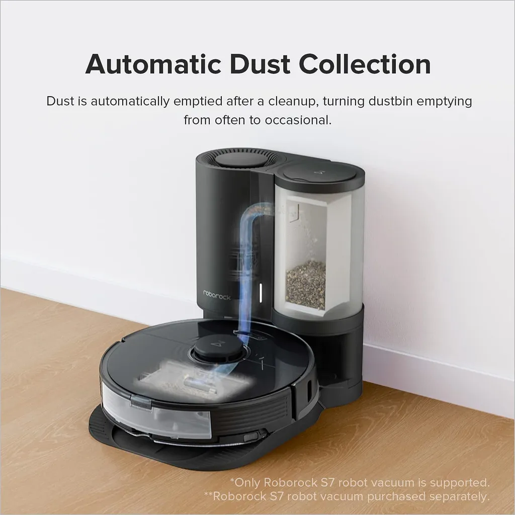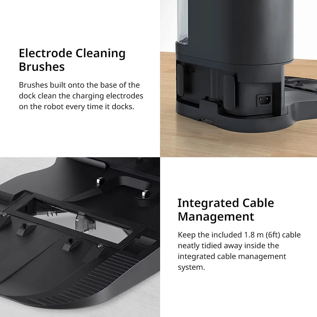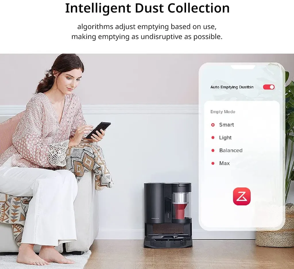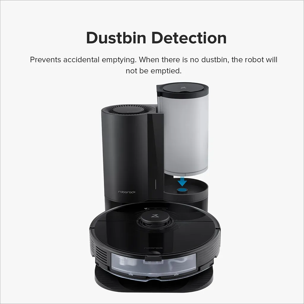 Intelligente Entstaubungsalgorithmen passen die Entleerung je nach Nutzung an. Die automatische Mülltonnenerkennung verhindert ein versehentliches Entleeren, wenn der Roboter andockt, wenn kein Mülleimer angebracht ist.