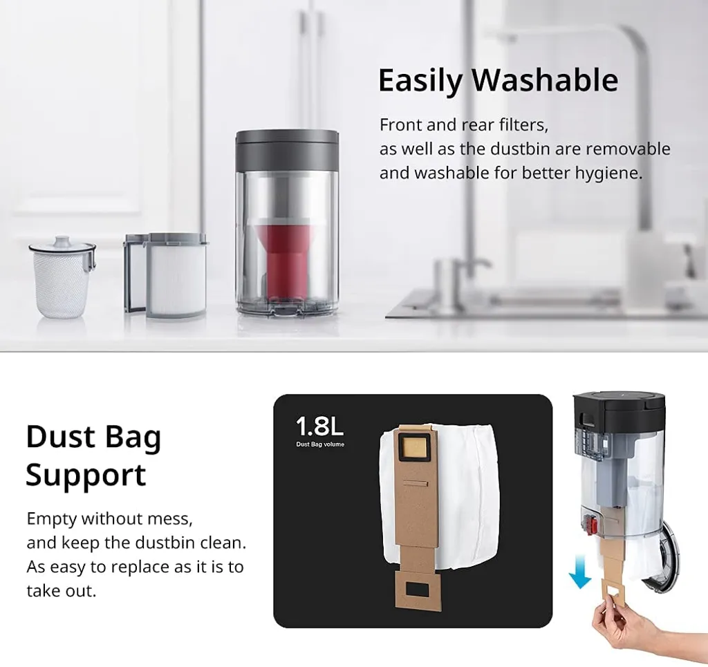 1,8 L Staubbeutelvolumen. Entleeren Sie sauber und halten Sie den Behälter sauber. So einfach zu ersetzen, wie es abnehmbar ist.