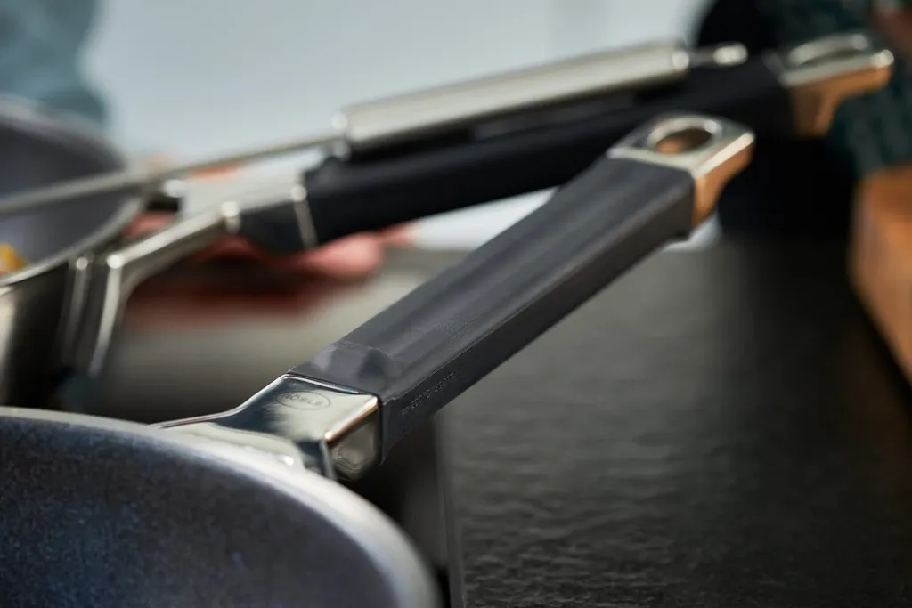 Pfannengriff liegt dank Silikonummantelung sicher in der Hand