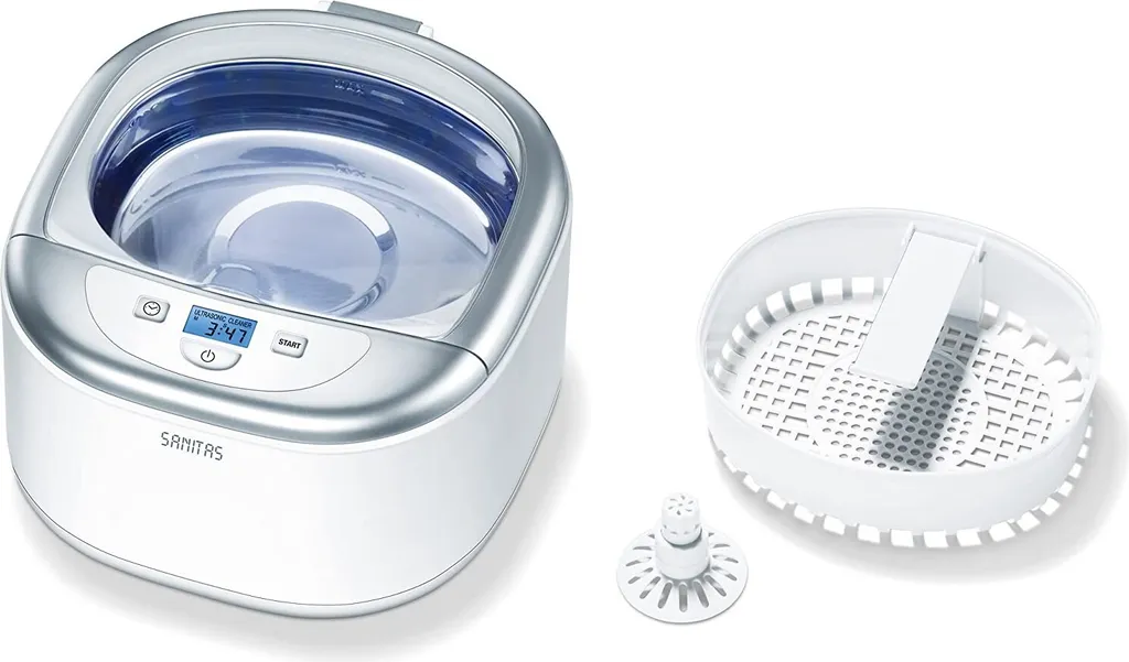 Mit dem Ultraschallreiniger SUR 42 von Sanitas lässt sich eine Vielfalt an Gebrauchsgegenständen mit fester Oberfläche, wie zum Beispiel Schmuck, Zahnersatz oder Brillen, mit Hilfe von Ultraschallwellen auf äußerst schonende und zugleich gründliche Art und Weise reinigen. Für Kleinteile ist im Lieferumfang ein herausnehmbares Sieb enthalten.