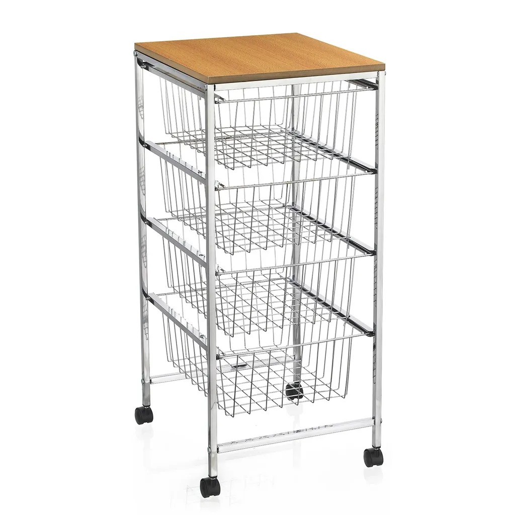 ist platzsparend und flexibel einsetzbar. Durch die vorhandenen Rollen, kann der Küchenwagen an jeden beliebigen Ort gestellt werden. 4 ausziehbare Drahtkörbe bieten ausreichend Möglichkeit die verschiedensten Utensilien aus Küche und Haushalt zu verstauen. Auf der robusten Ablageplatte aus hochwertiger MDF Platte können noch zusätzliche Dinge abgestellt werden.