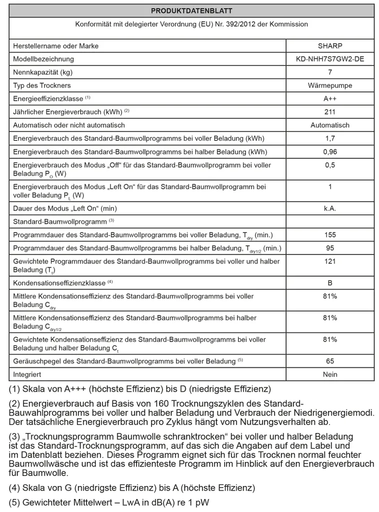 Sharp KD-NHH7S7GW2-DE Wärmepumpentrockner 7 kg 15 Trockenprogramme EEK: ( bis D)