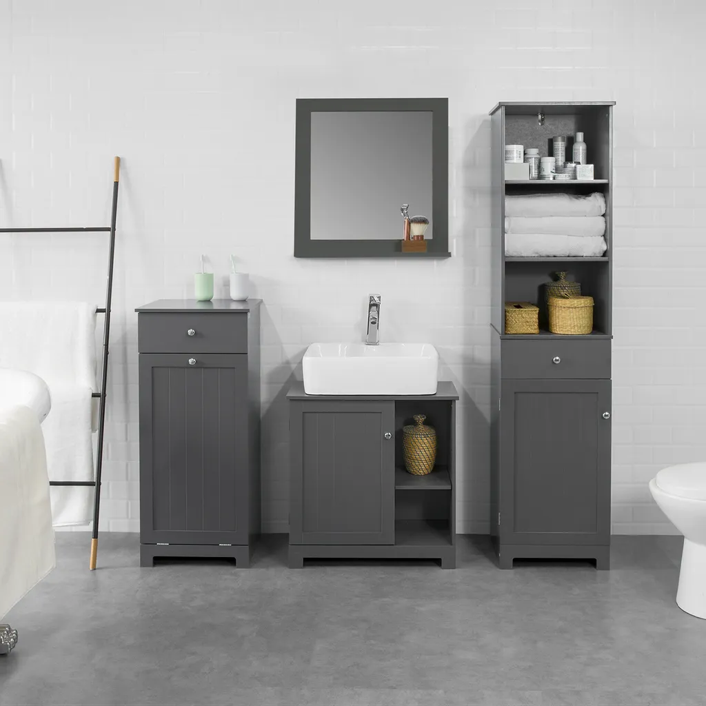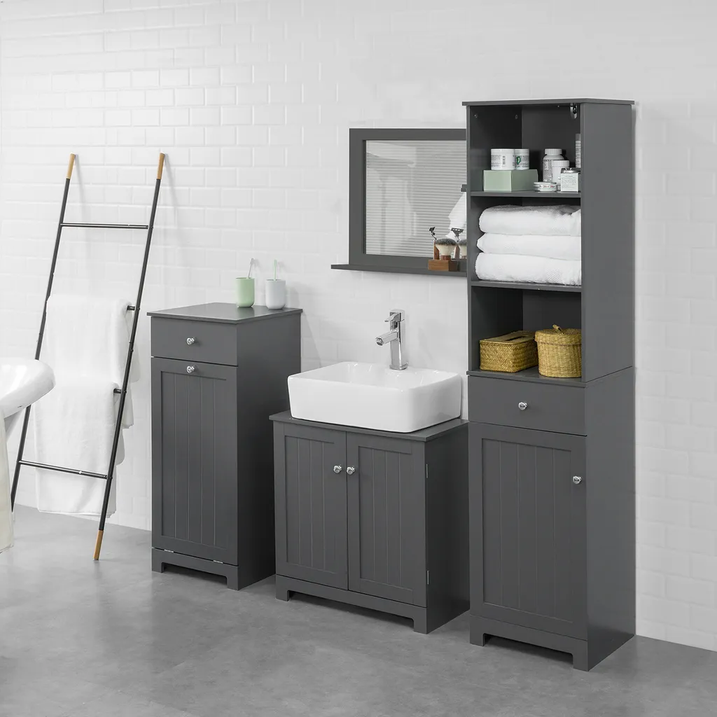 Der Schrank in grau wirkt puristisch und edel und passt in jeden Raum und zu jedem Möbelstück. Wie z.B. im Badezimmer, Schlafzimmer oder andere freie Ecke im Zuhause.