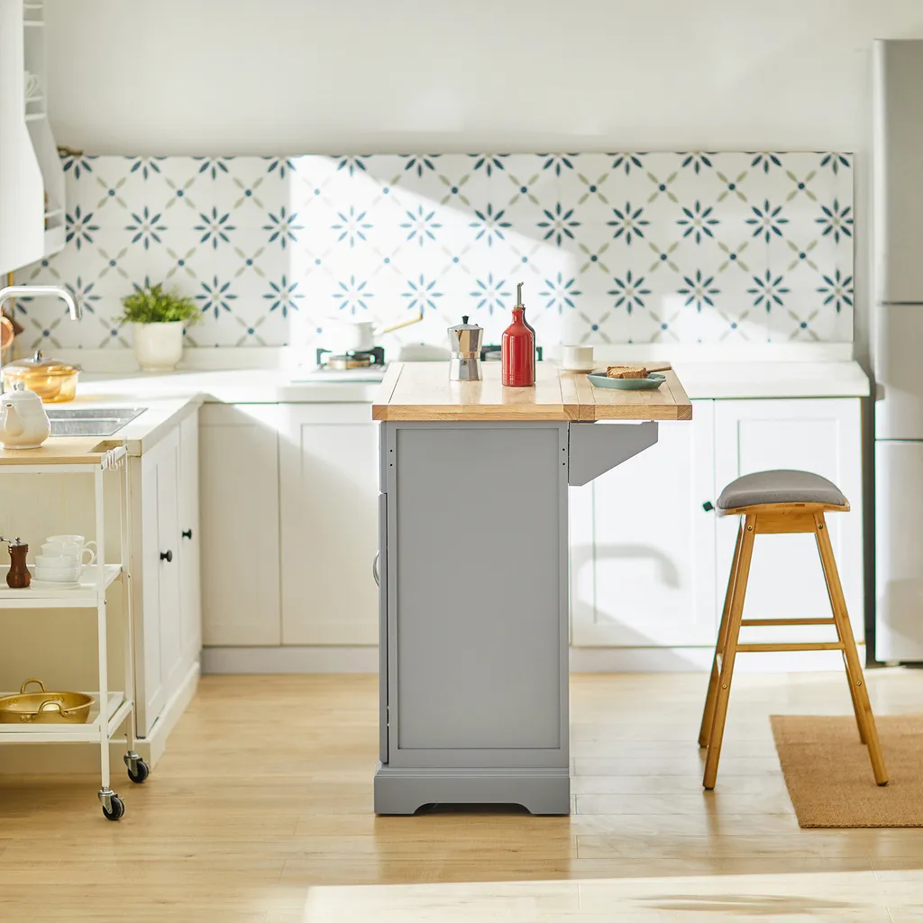 Die Arbeitsfläche aus Kautschukholz bietet viel Platz zum Ablegen und zur Zubereitung von Lebensmitteln. Zudem können Sie mit Hilfe der auf der Rückseite erweiterbaren Arbeitsfläche noch mehr Arbeitsplatz schaffen.