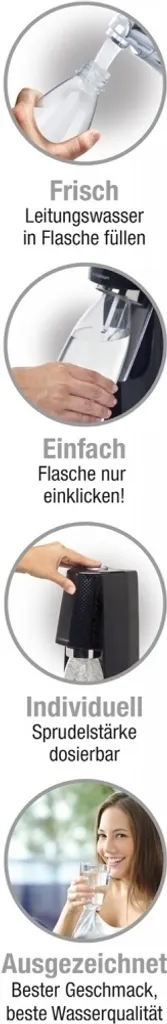 Die Sprudelstärke ist individuell dosierbar und die Flasche in eleganter neuer Form wird dafür einfach nur eingeklickt