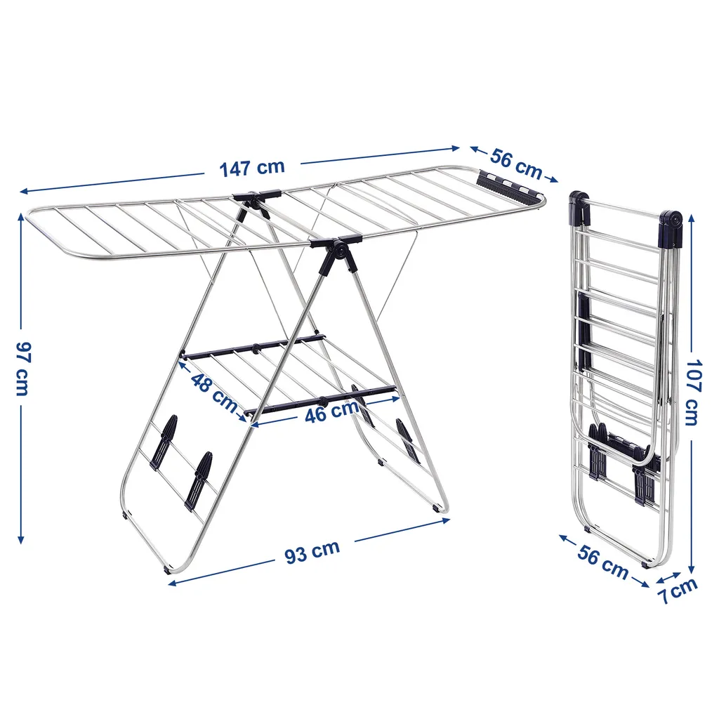 Mit einer vollständig aufgeklappten Größe von 147 x 128 x 56 cm (B x H x T) erreicht dieser Wäschetrockner eine Trockenlänge von 16 m, optimal für ca. 2 Waschmaschinenfüllungen aus; auf den beiden Trockenflügeln lassen sich Kleidungsstücke, Bettzeug oder Bettdecken gut trocknen; max. Belastbarkeit des Wäscheständers beträgt 20 kg