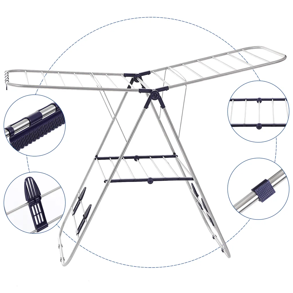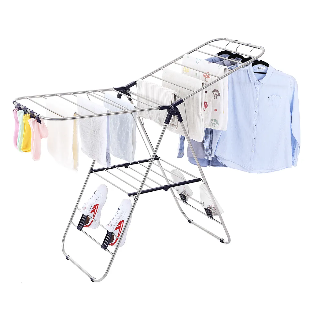 Die 26 zusätzlichen Kleinteilhalter halten Socken, Unterwäsche oder Tücher; zwischen den Beinen des Flügelwäscheständers befinden sich weitere Trockenstangen für weniger große Kleidungsstücke wie Kinderkleidung usw.; nasse Schuhe kann man auch einfach auf die 4 unteren verschiebbaren Haken hängen