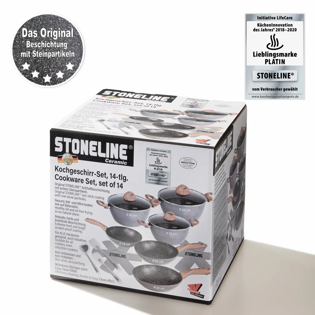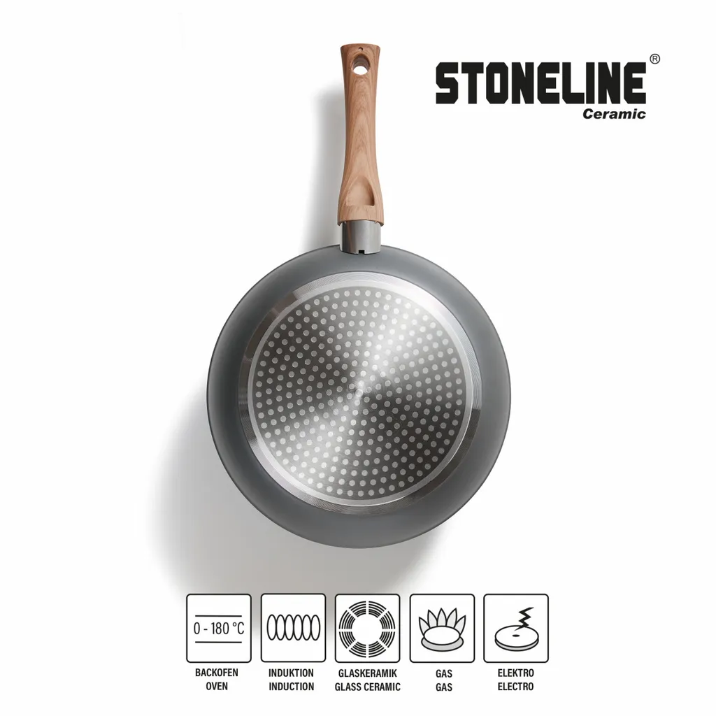 Dank der extrem harten, langlebigen STONELINE® CERAMIC Beschichtung mit Lotus Abperl-Effekt werden Sie zukünftig noch mehr Freude beim Zubereiten Ihrer Speisen haben! Hierbei spielt es keine Rolle, ob Sie auf Glaskeramik, Induktion, Elektro oder Gas kochen.