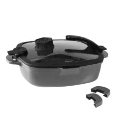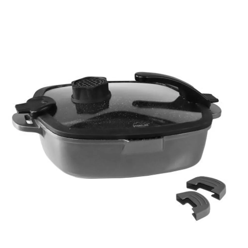 Im Set enthalten ist neben dem Smell Well Glasdeckel mit Siebfunktion außerdem die STONELINE® FUTURE Eckpfanne mit 24 x 24 cm. Die Eckpfanne hat mit 6,7 cm einen extra hohen Rand und ein Fassungsvermögen von ca. 3,0 Liter und eignet sich dadurch hervorragend für alle Brat- und Schmorgerichte!