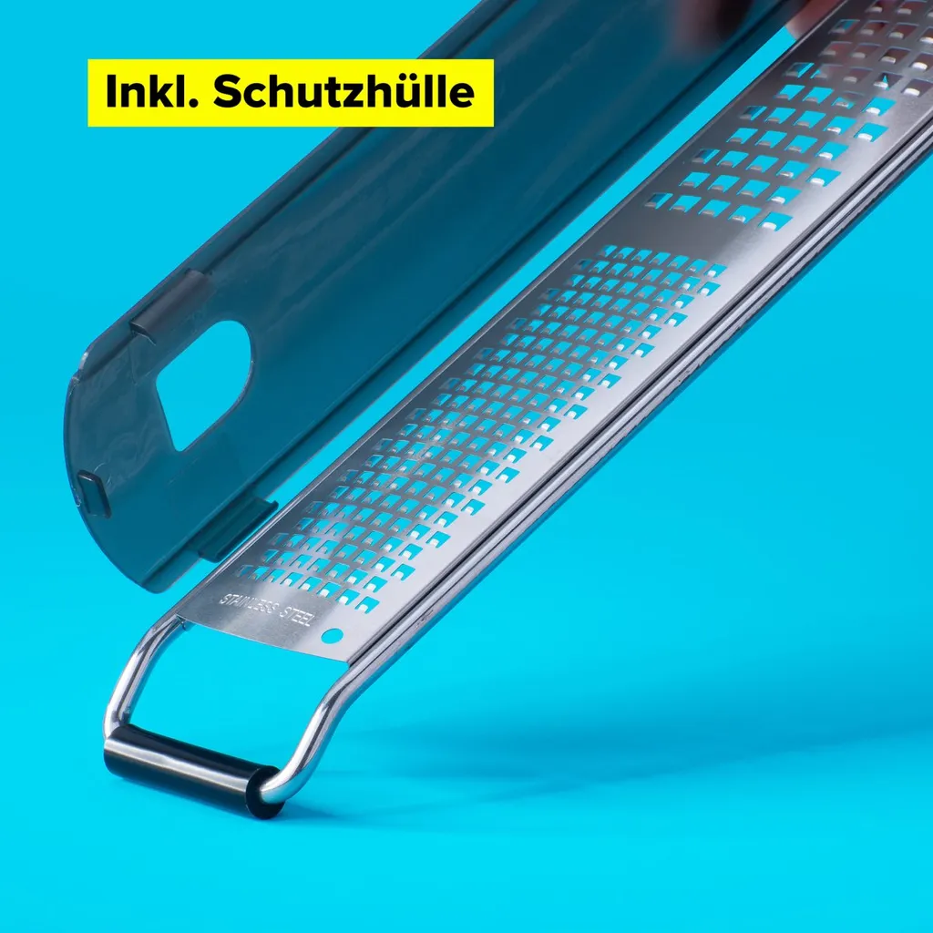 Fein oder grob? Die Reibe hat zwei Flächen aus rostfreiem Edelstahl, damit du flexibel jederzeit wechseln kannst. Außerdem liegt der Softtouch-Griff in Dunkelblau mit Aufhängöse super angenehm in der Hand.